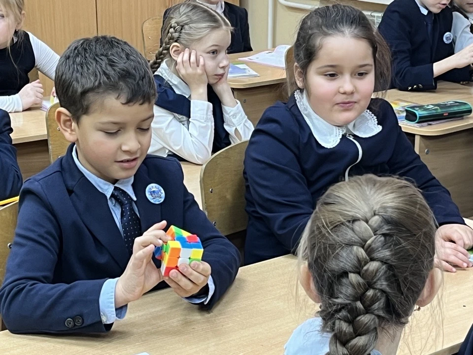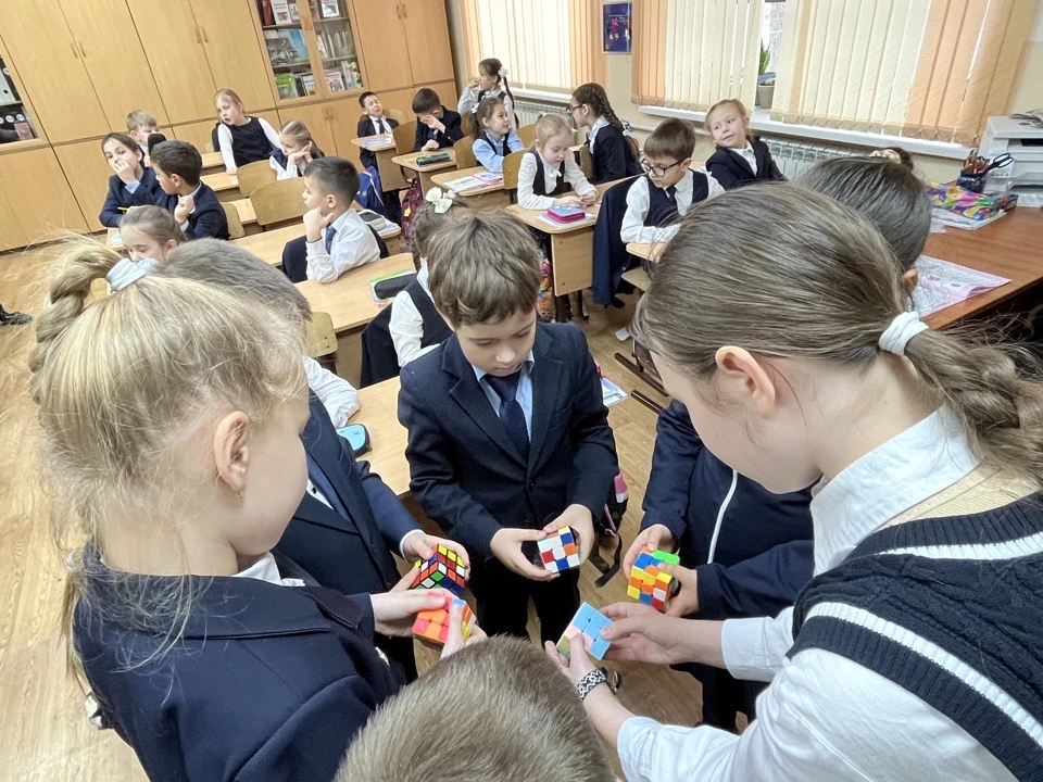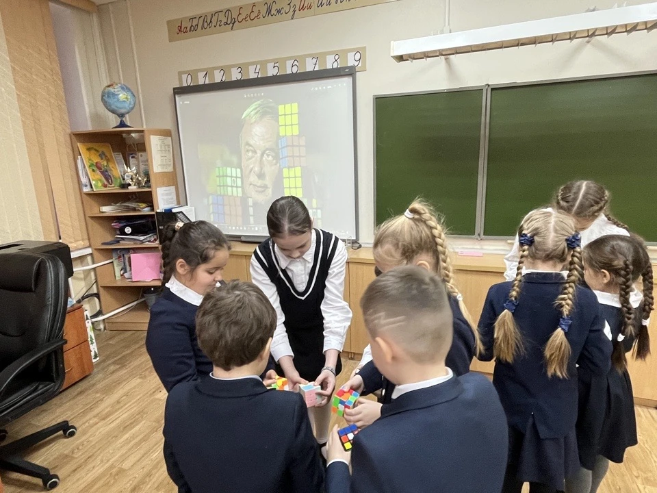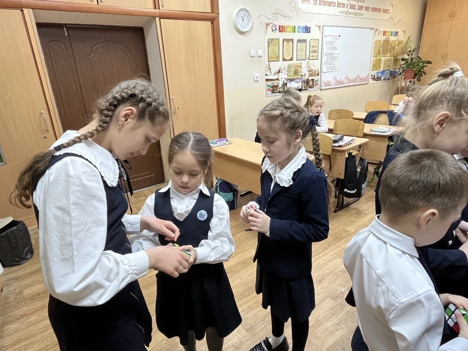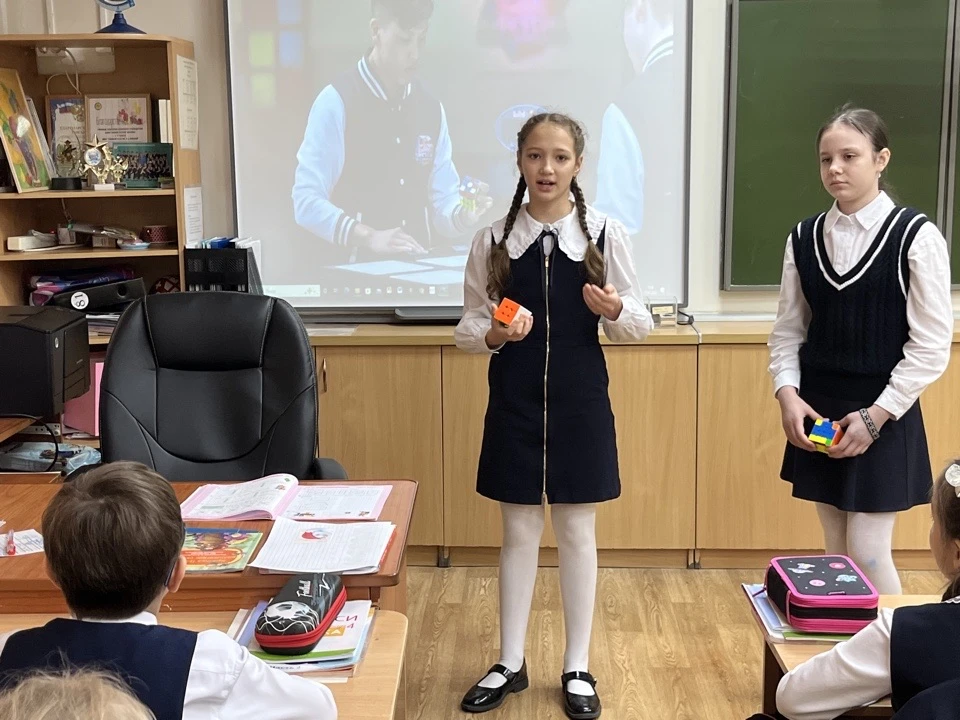 Девочки из 5а класса знакомили первоклассников с одной из базовых комбинаций сборки кубика.