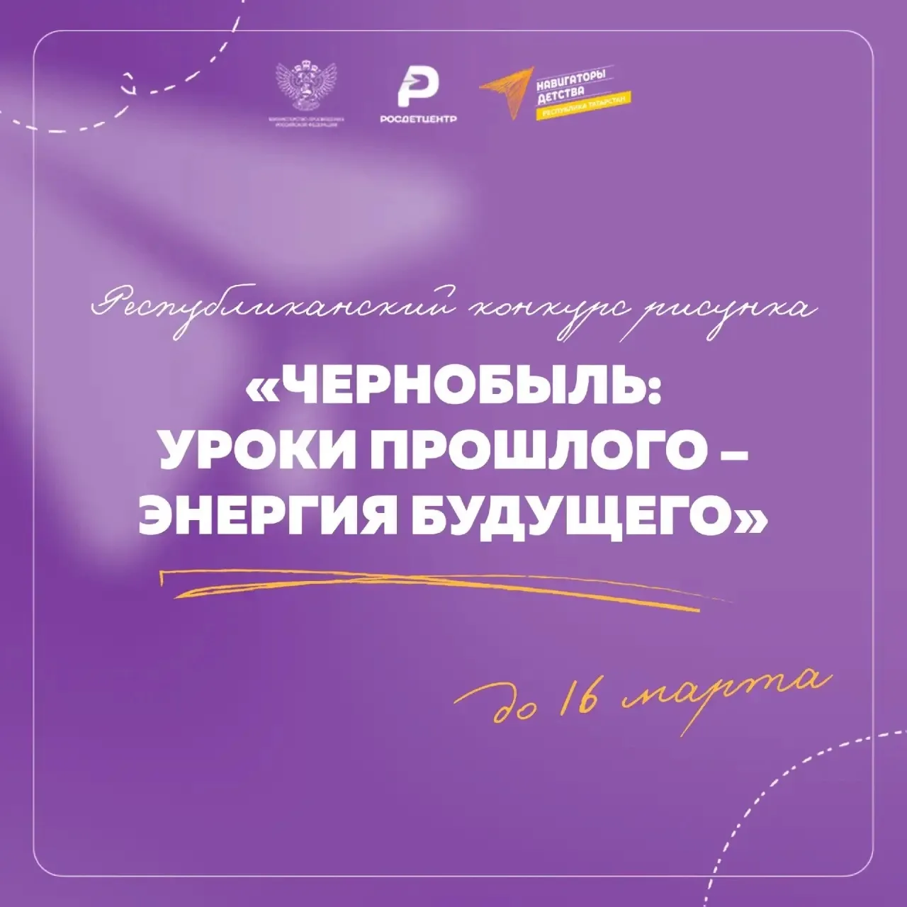 «Навигаторы детства» Республики Татарстан совместно с Республиканским центром внешкольной работы приглашают обучающихся в возрасте от 10 до 18 лет принять участие в Республиканском конкурсе рисунка «Чернобыль: уроки прошлого — энергия будущего», посвящённом 40‑летию трагедии ☢️