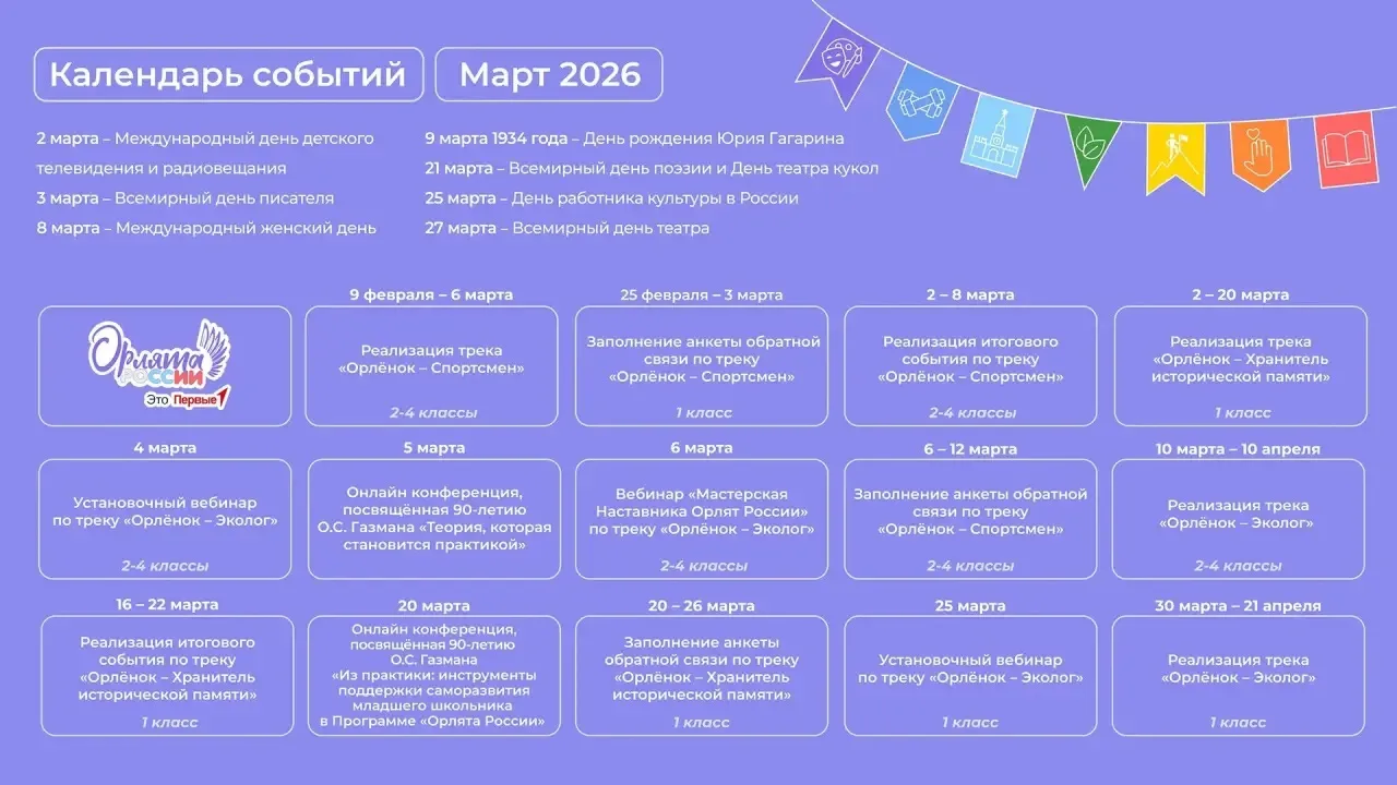 Совсем скоро к нам придет календарная весна, а значит пора обновить и календарь событий. В марте Орлят, Учителей и Наставников Орлят, а также советников директоров по воспитанию ждут: