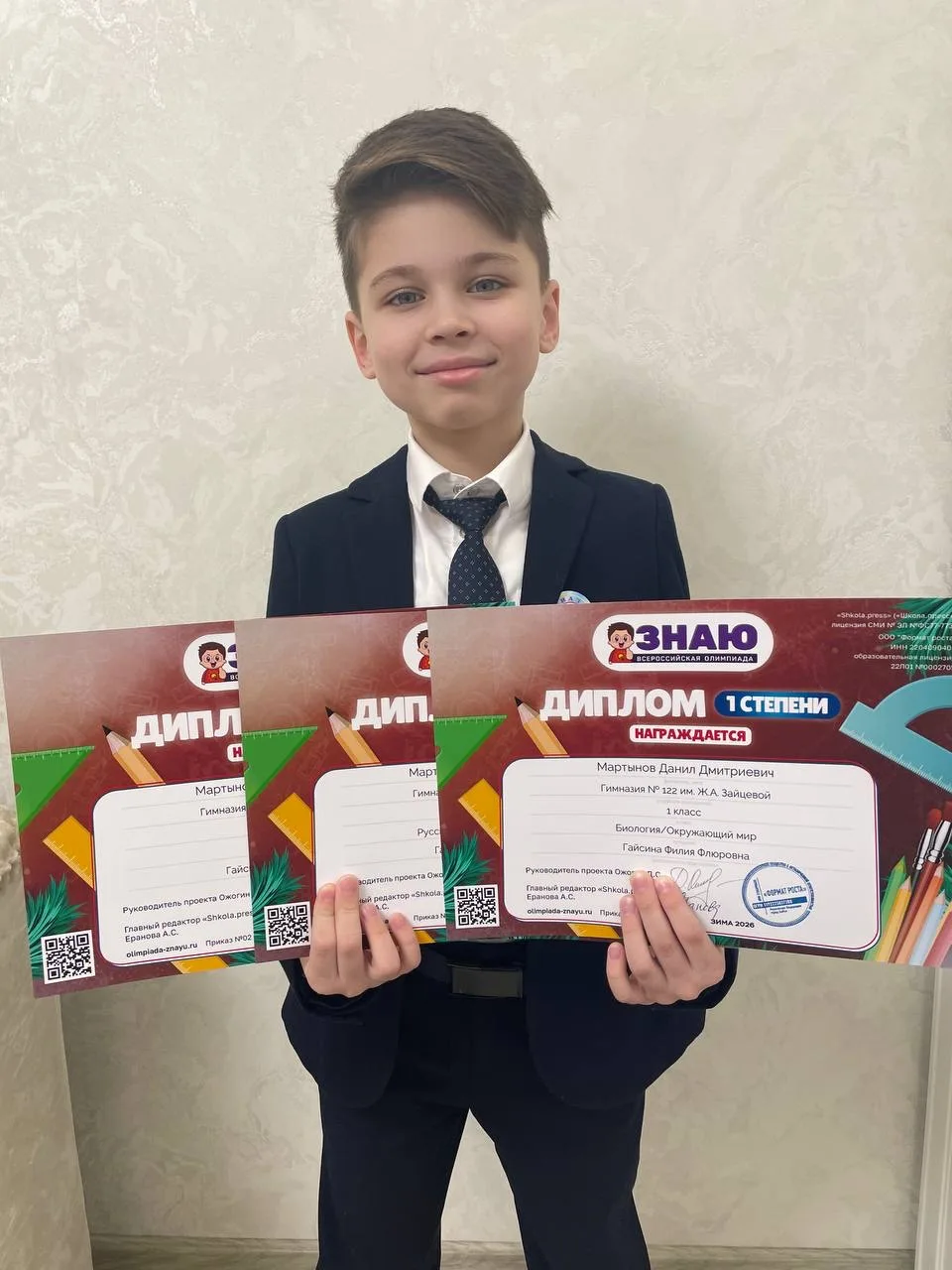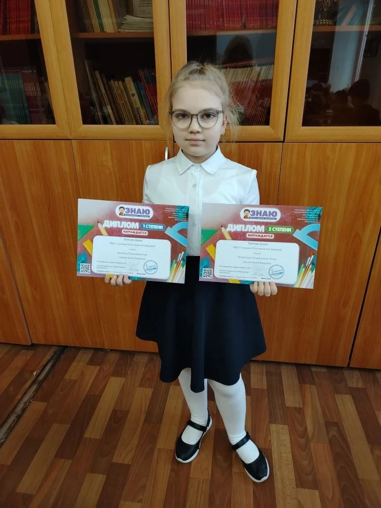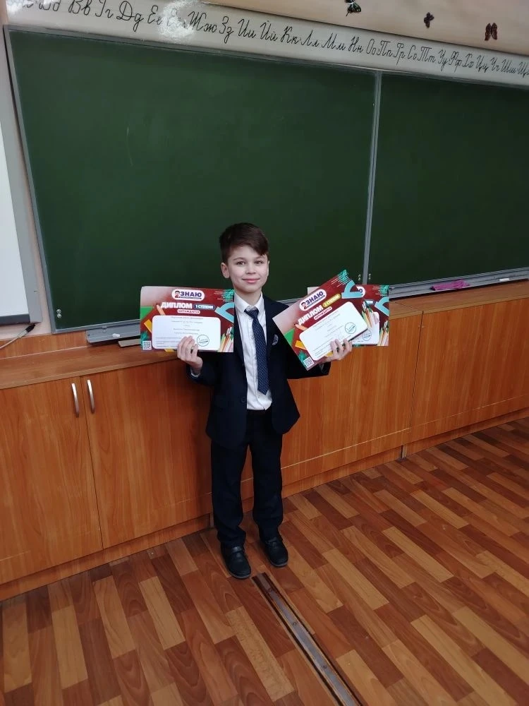 Ученик 1 «Г» класса принял участие во Всероссийской олимпиаде «Знаю» по математике, русскому языку и окружающему миру и был награждён дипломами I степени! 👏📚
