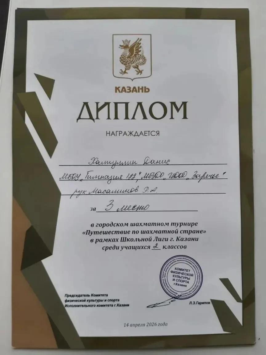 С гордостью сообщаем, что Халиуллин Данис, ученик 2А класса, занял 3 место в городском шахматном турнире «Путешествие по шахматной стране», который проходил в рамках Школьной Лиги г. Казани среди учащихся 2 классов! ♟️🏆