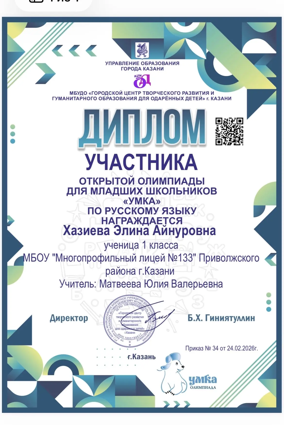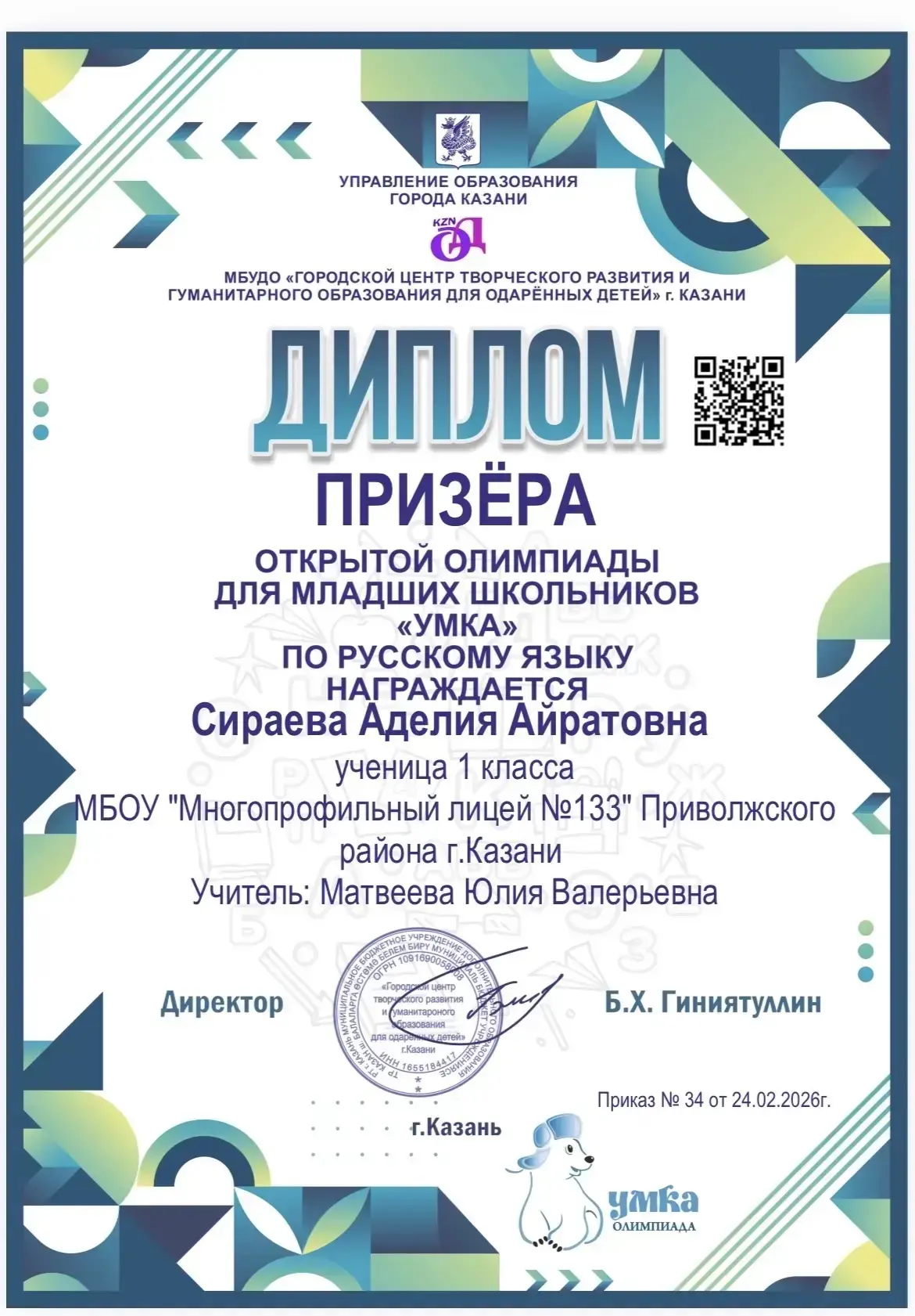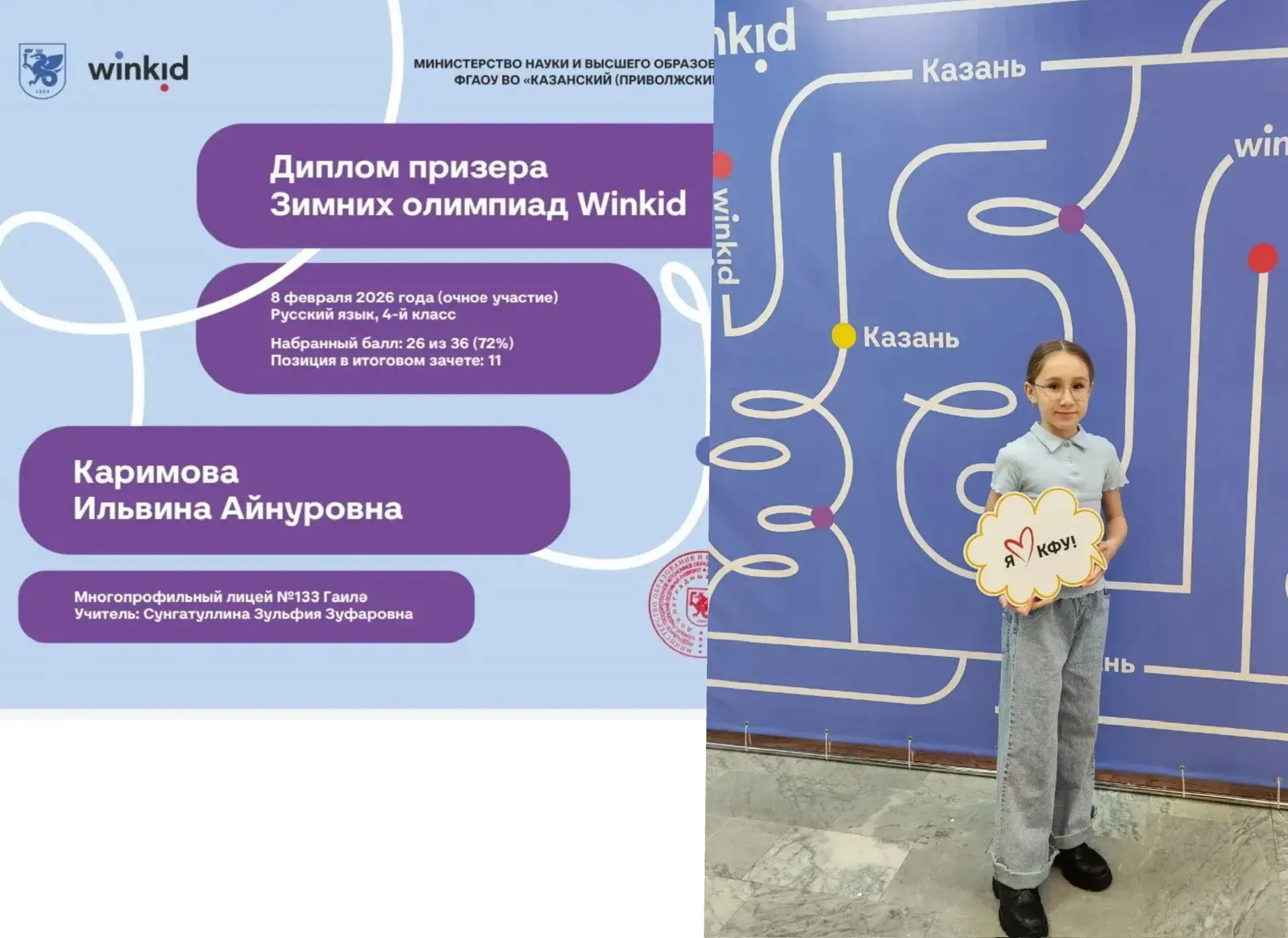 (учитель - Сунгатуллина З.З.), которая стала призером олимпиады по русскому языку Winkid! Это достижение является результатом упорного труда, старания и любви к языку.Winkid — это престижное соревнование, которое проводится Казанским федеральным университетом при поддержке Министерства образования и науки Республики Татарстан. Она позволяет школьникам проявить свои знания и навыки в различных предметных областях. Желаем нашему призеру дальнейших успехов в учебе и новых побед на олимпиадах!💫
