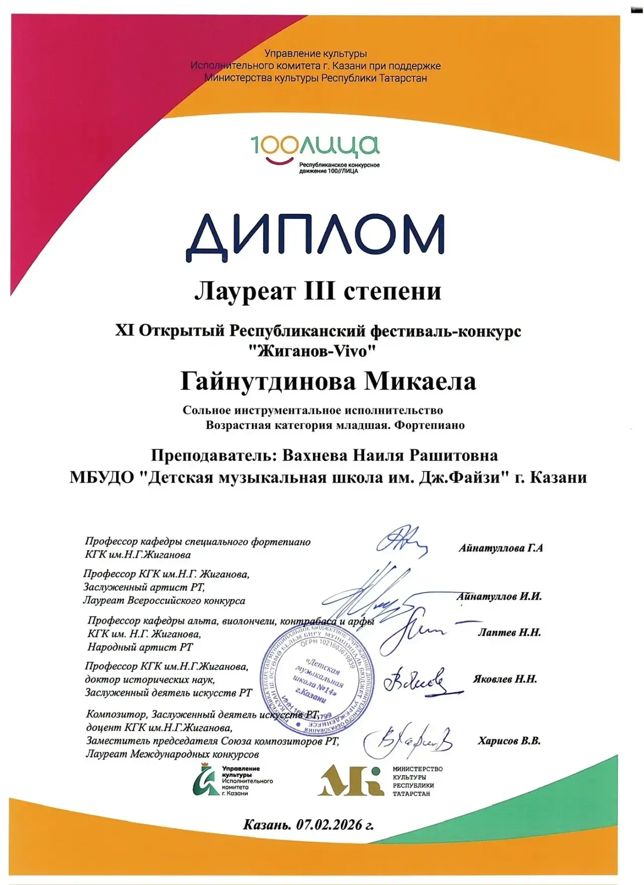 Звания Лауреата III степени удостоена Гайнутдинова Микаела (преп. Вахнева Наиля Рашитовна).