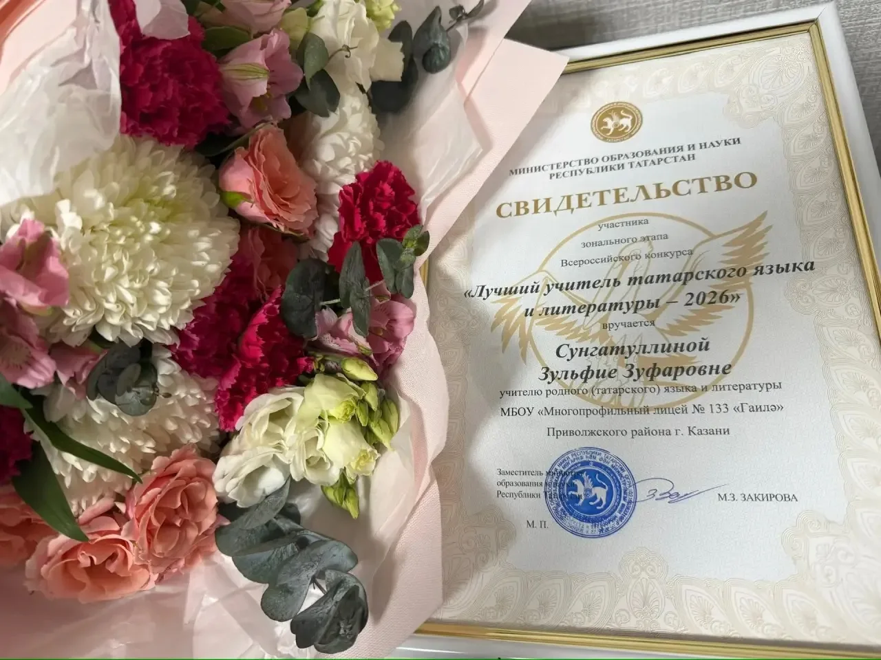 🎉🎊Мы спешим поздравить учителя родного (татарского) языка и литературы нашего лицея «Гаилә» — Сунгатуллину Зульфию Зуфаровну с достойным прохождением очередного этапа Всероссийского конкурса «Лучший учитель татарского языка и литературы – 2026»!🎉🎊