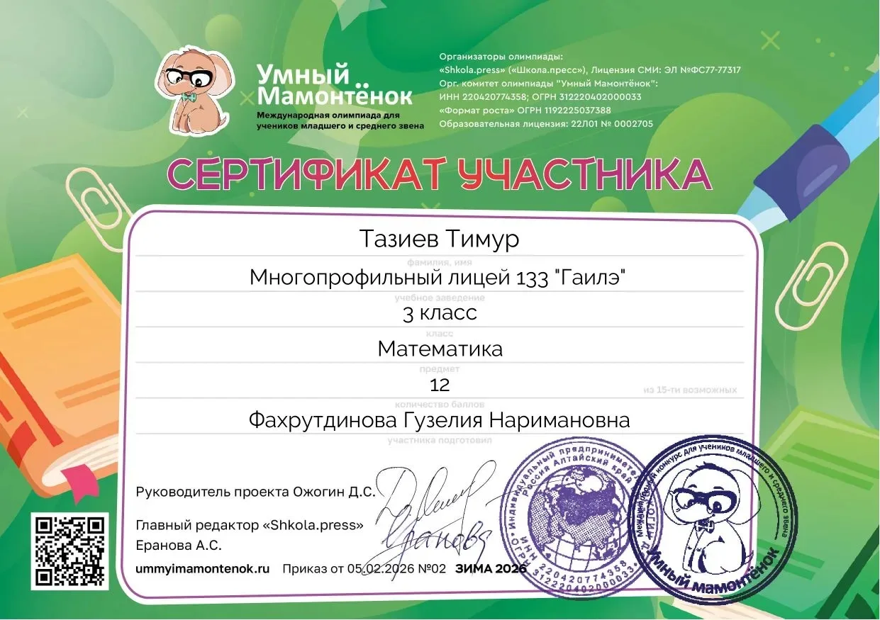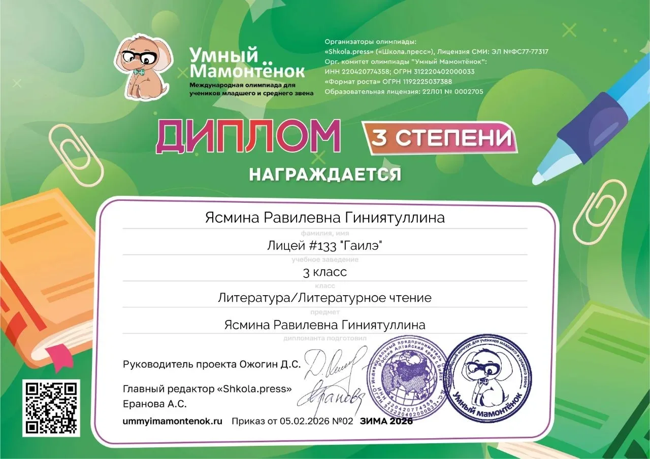 Ученицы 1 «Д» класса окунулись в увлекательное интеллектуальное состязание — Олимпиаду «Умка»! Мы сердечно поздравляем наших юных звездочек: талантливую Сираеву Аделию, завоевавшую почетное звание призера, и очаровательную Хазиеву Элину, достойно представившую нашу школу среди участников соревнований. Пусть этот старт вдохновит девочек на новые свершения и победы!