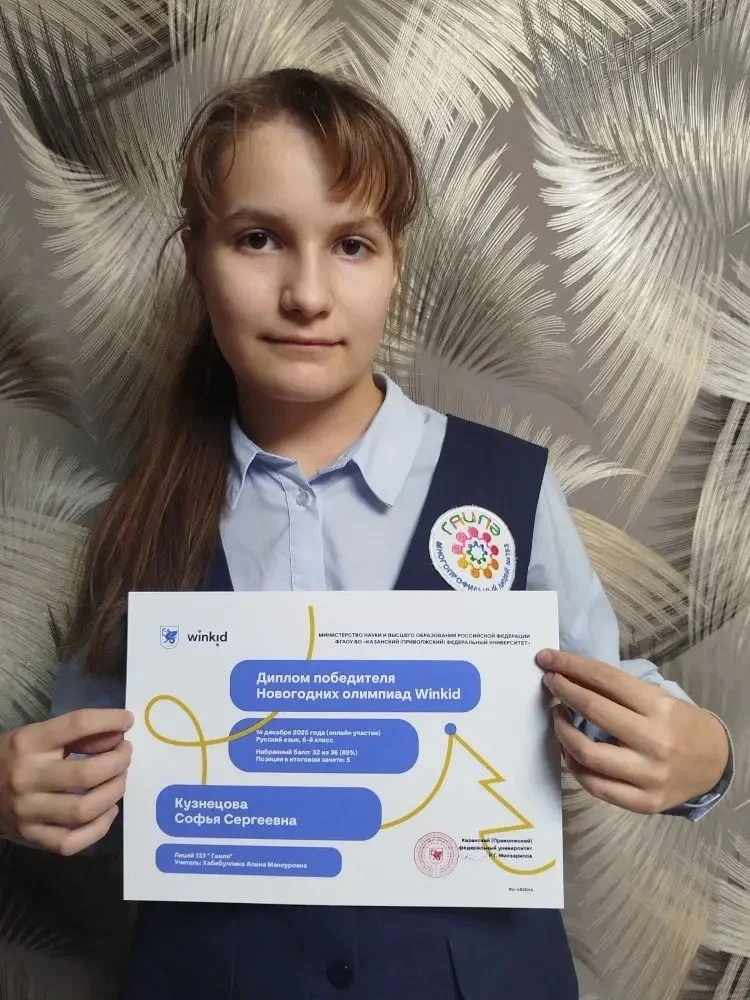 Высокий результат на Новогодних олимпиадах Winkid от Казанского федерального университета показала ученица 6б класса Софья Кузнецова по предмету "Русский язык"