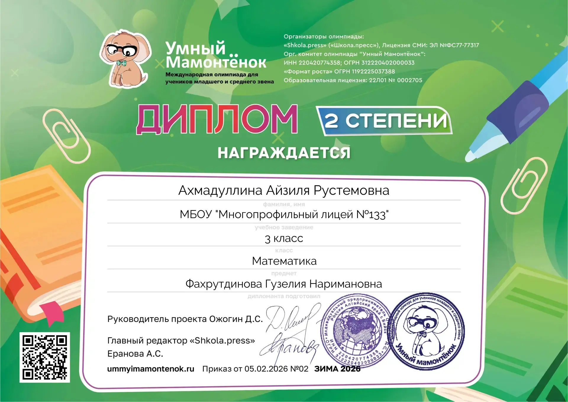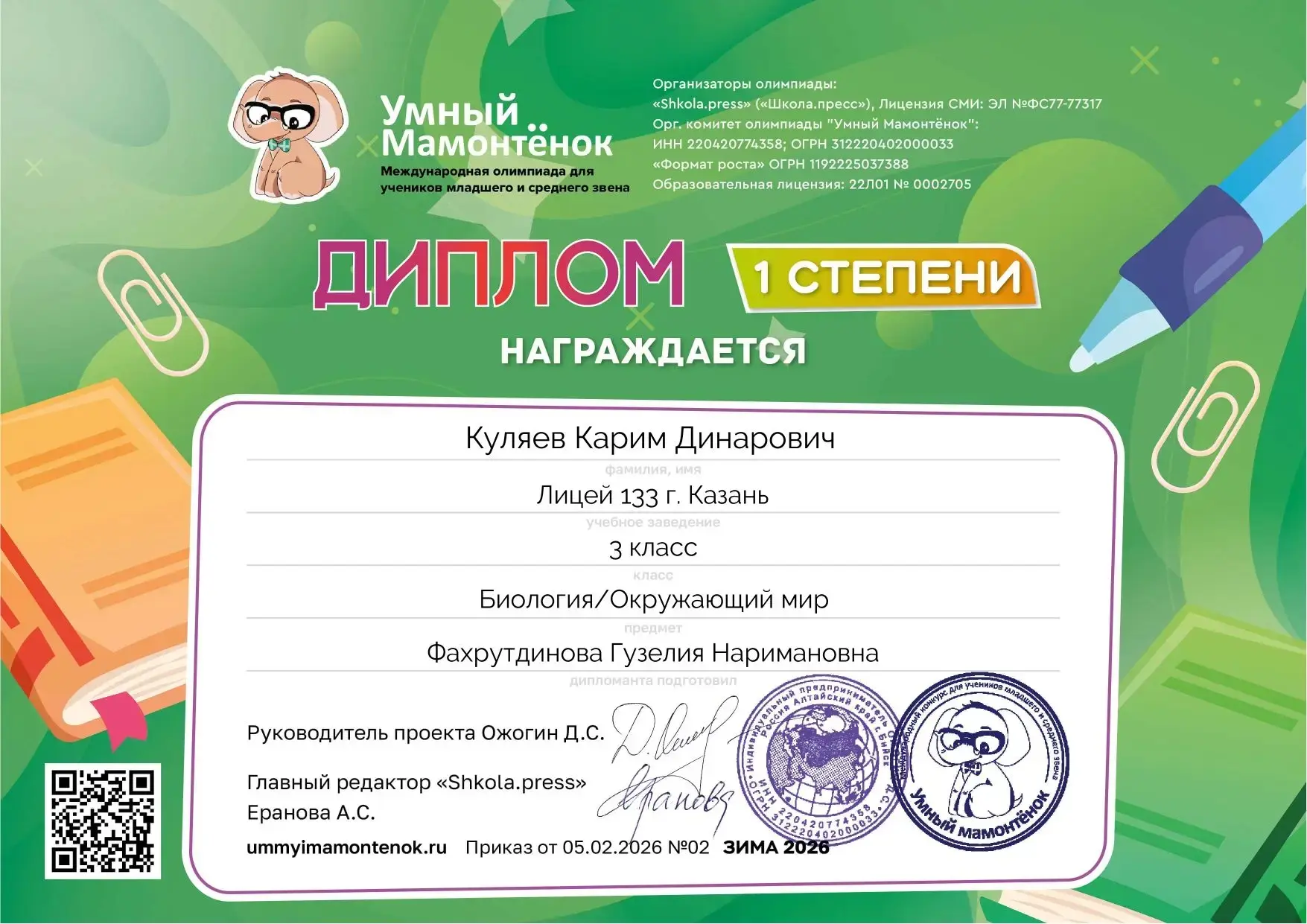 Ученики 3В класса приняли участие в международной олимпиаде "Умный Мамонтёнок" И заняли призовые места 🎉