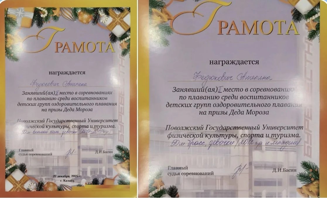 27.12.25 состоялись соревновая среди воспитанников детских групп оздоровительного плавания на призы Деда Мороза, в Поволжском Государственном Университете физической культуры, спорта и туризма "Буревестник".