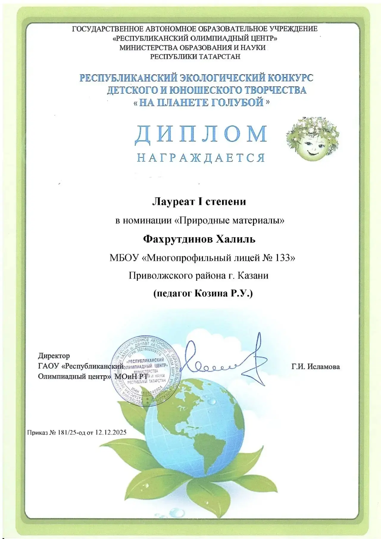 Фахрутдинов Халиль ученик 2А класса принял участие в республиканском экологическом конкурсе детского и юношеского творчества и стал лауреатом I степени в номинации "Природные материалы"