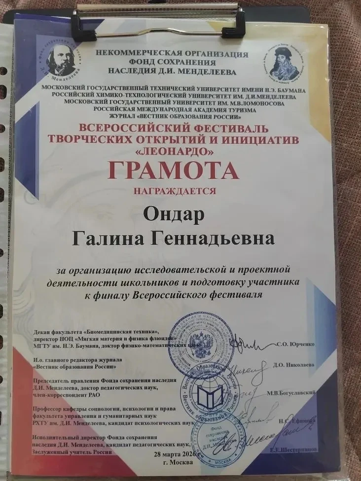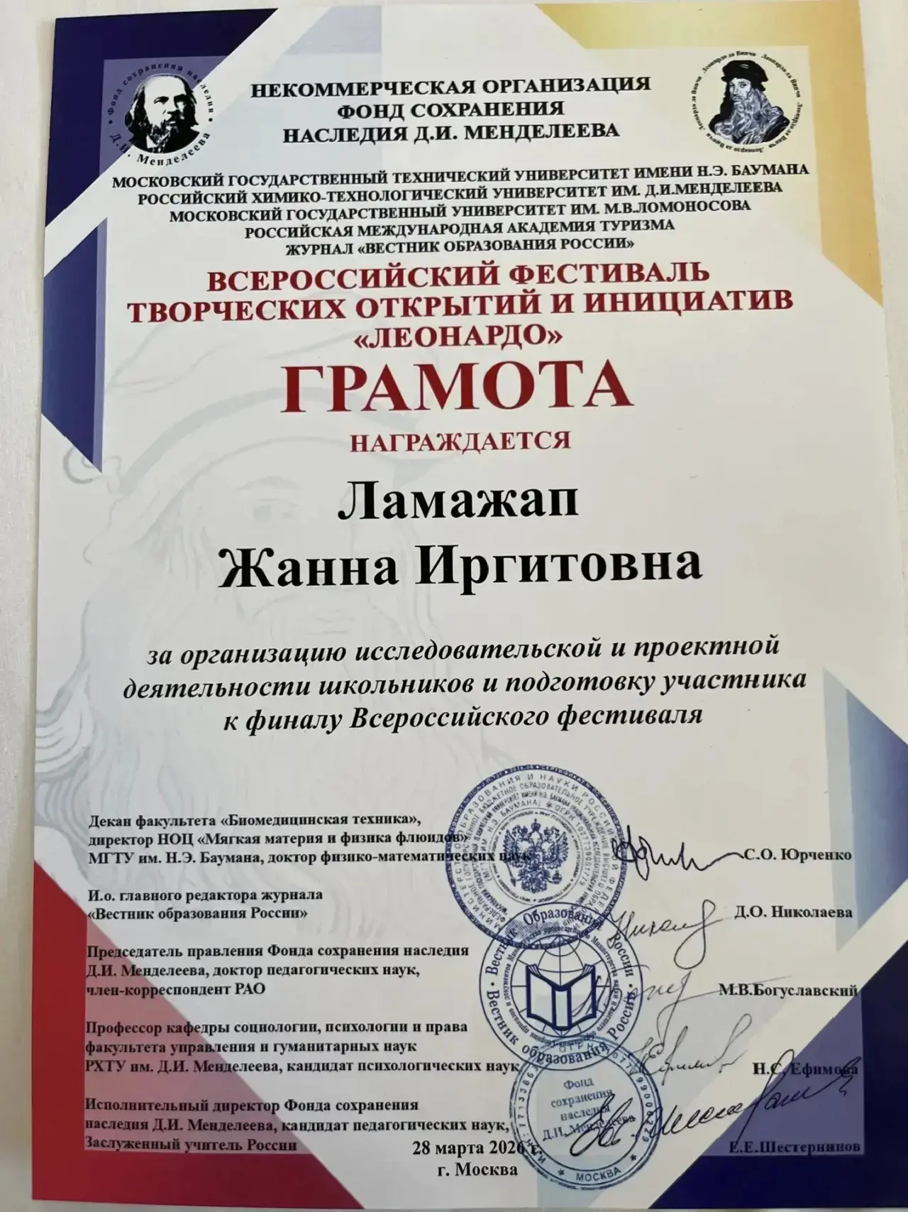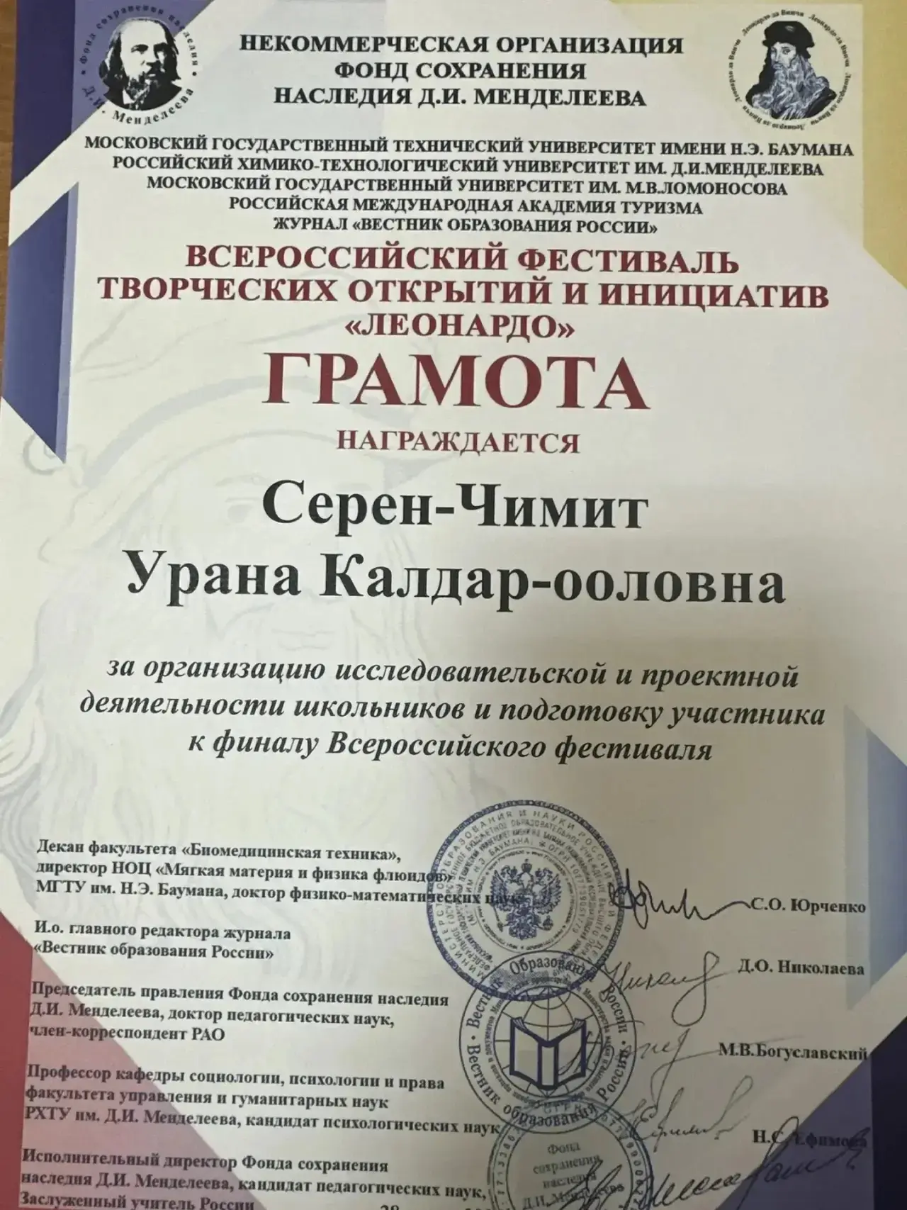 От всей души благодарим организаторов конкурса за этот праздник науки. Ондар Рада Александровна, Ламажап Жанна Иргитовна по завершению фестиваля были награждены медалями "За службу образованию". Пожелаем дальнейших творческих успехов руководителям и детям!