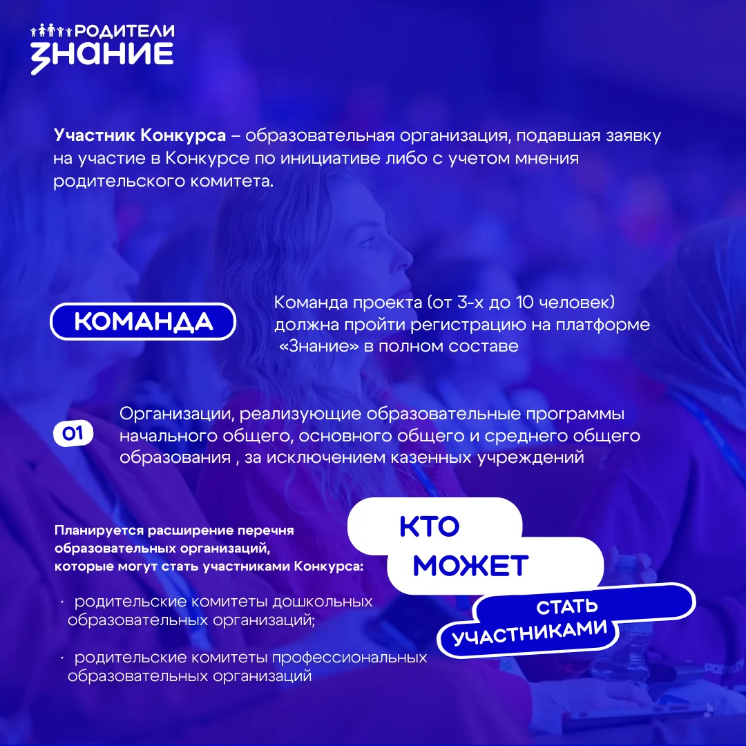 ❗️Обратите внимание, что планируется расширение перечня образовательных организаций, которые могут стать участниками Конкурса: родительские комитеты дошкольных образовательных организаций и родительские комитеты профессиональных образовательных организаций.