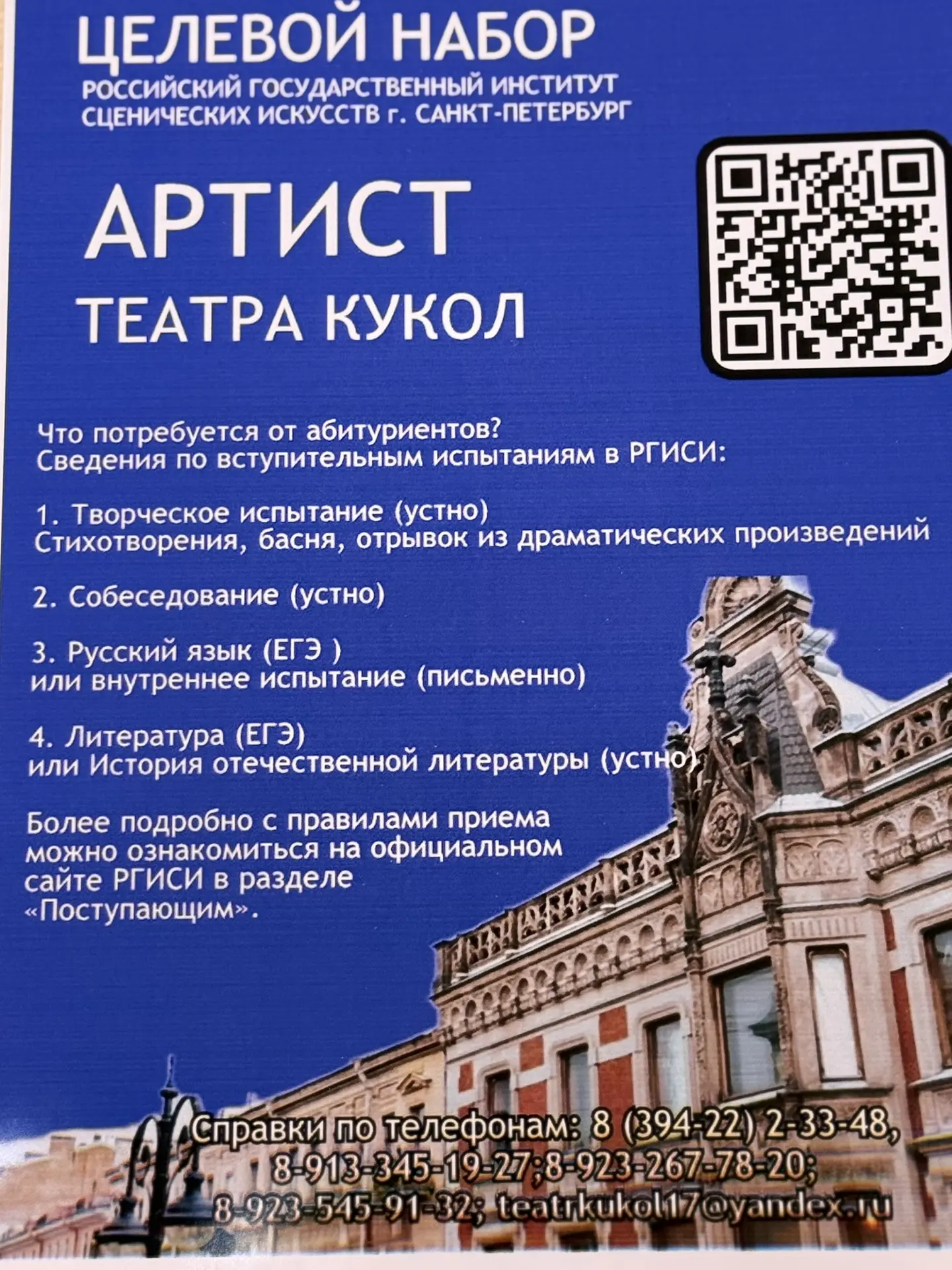 Артисты провели профориентационную работу для выпускников. Познакомили с Российским Государственным Институтом Сценических Искусств г. Санкт- Петербурга (целевым набором) Гости показали отрывки из спектаклей " Степь", "Старик и море", "Шагаа". Ребята затаив дыхание просмотрели отрывки, внимательно слушали и следили за действиями из отрывков кукольных спектаклей. После спектакля школьники задавали вопросы, а артисты поделились секретами своей профессии. Творческая встреча получилась очень интересной и увлекательной.