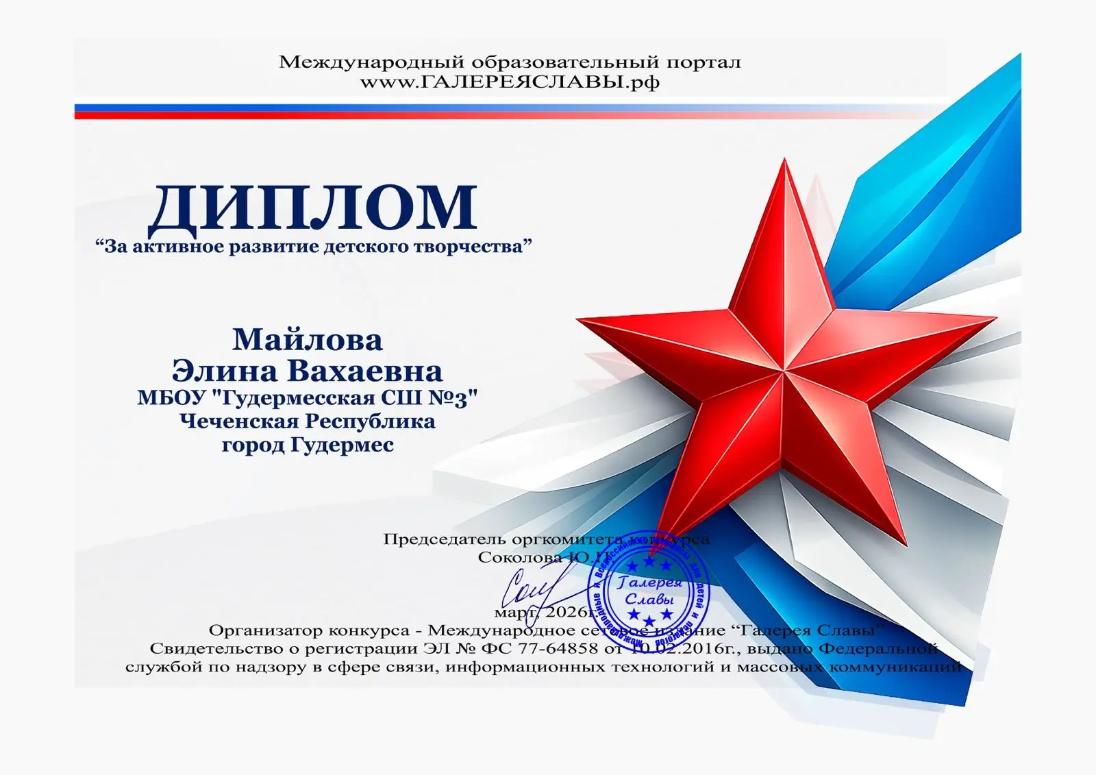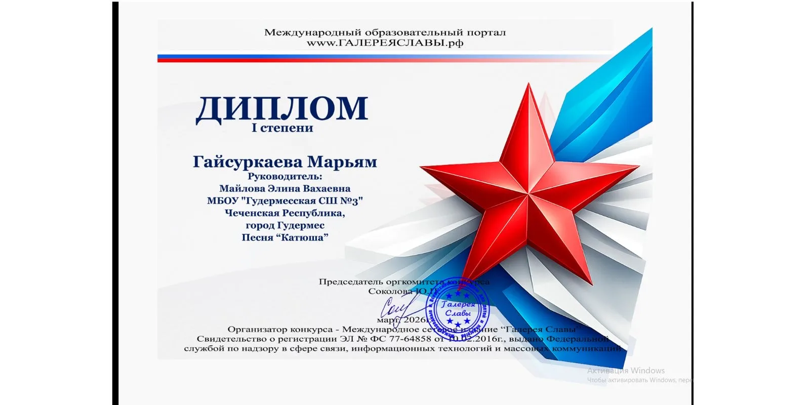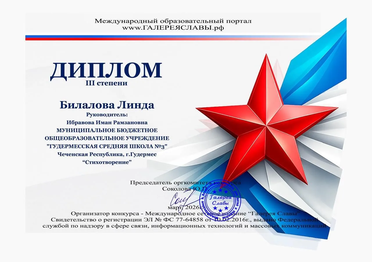 По итогам конкурса Гайсуркаева Марьям, ученица 4 Б класса, награждена дипломом I степени, а Билалова Линда, ученица 10 естественно-научного класса, — дипломом III степени.