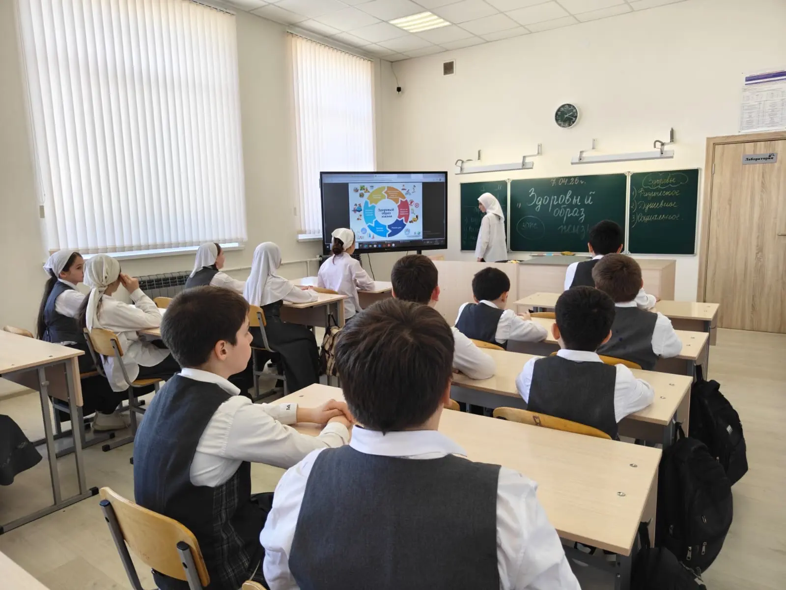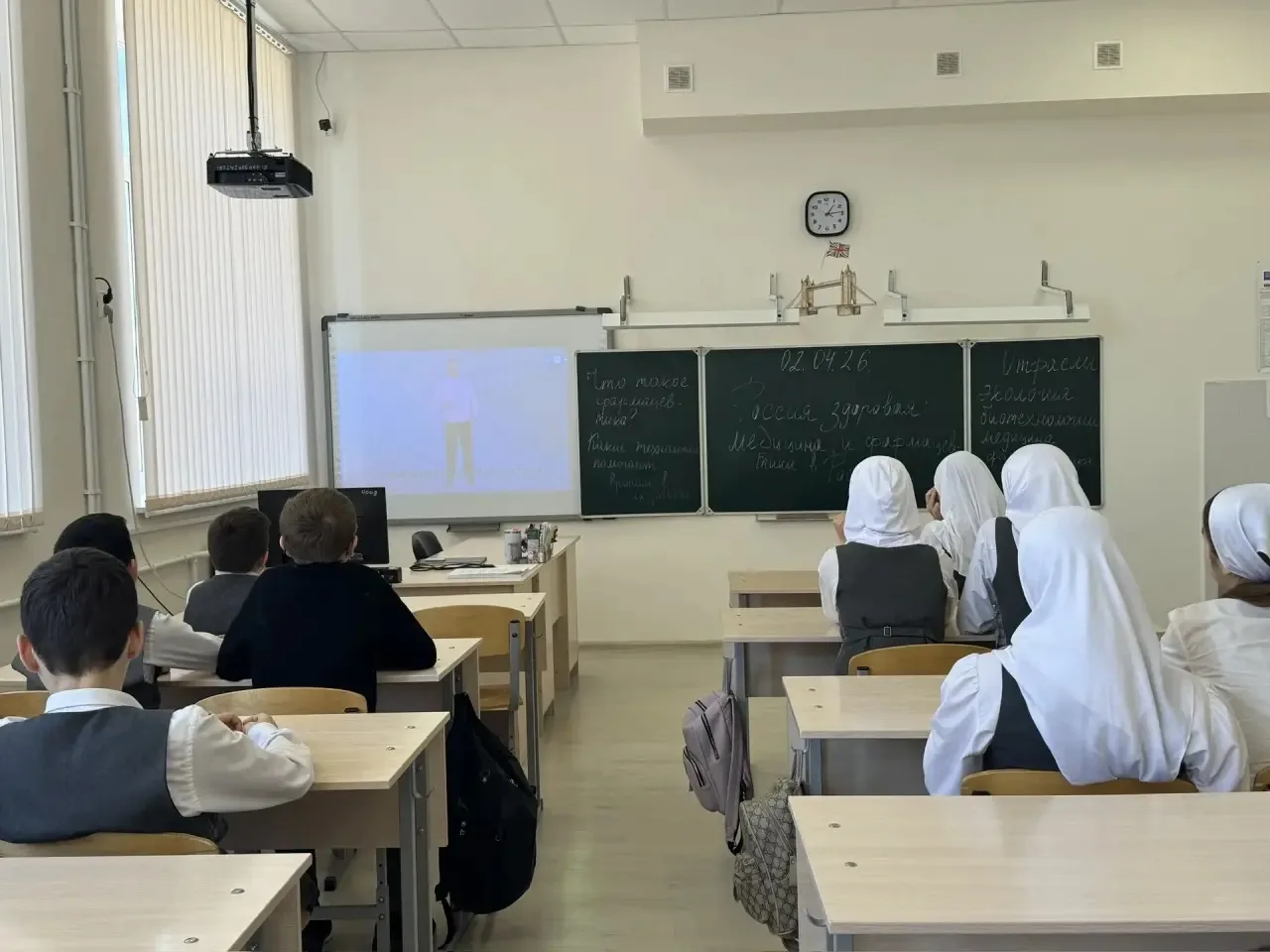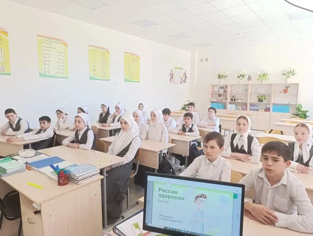 02.04.2026г в МБОУ «Новотерская СОШ им. Э. Хамидова» прошли классные часы среди учащихся 5–11 классов на тему: «Россия — мои горизонты. Россия — здоровая». Цель мероприятия заключалась в воспитании патриотизма и гордости за Родину, формировании интереса к культуре, истории и природным богатствам России, продвижении здорового образа жизни, а также повышении информированности о значении медицины и фармацевтики для общества и страны.