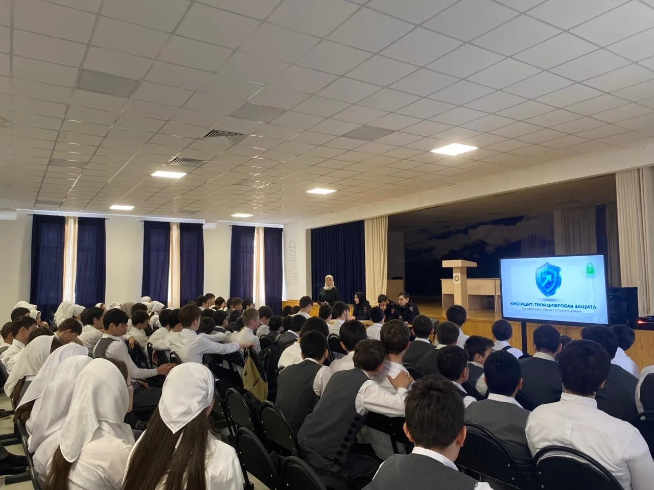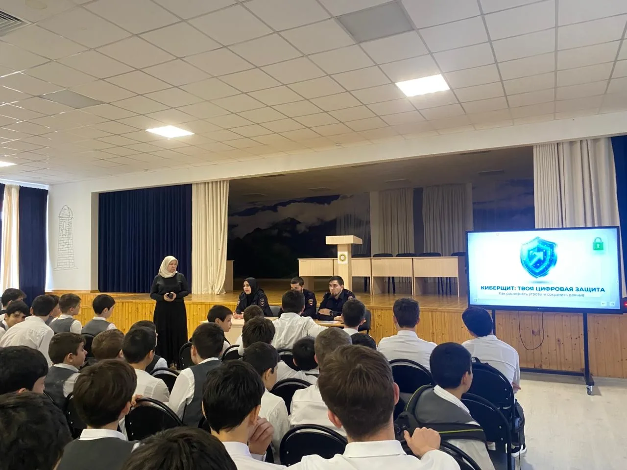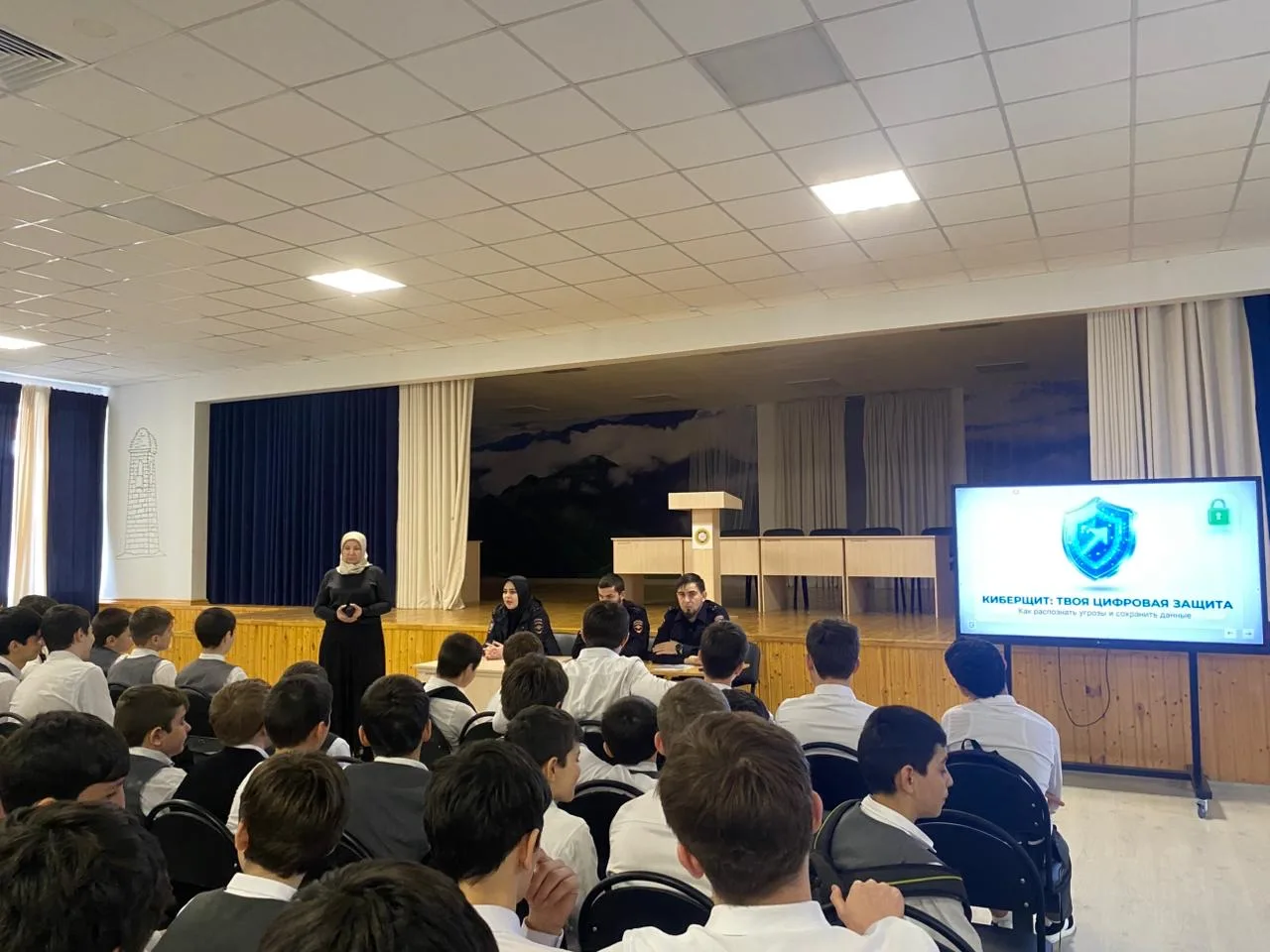 08.04.26г в МБОУ «Новотерская СОШ им. Э. Хамидова» прошло мероприятие на тему «Кибербезопасность. Основные угрозы в сети интернет и способы защиты.» Участниками этого события стали старший лейтенант полиции Джалуева Х.А., капитан полиции Висалиев М.Б. и младший лейтенант полиции Улубаев А.З., которые приняли активное участие и донесли до учащихся и педагогов важную информацию о киберугрозах и способах защиты.
