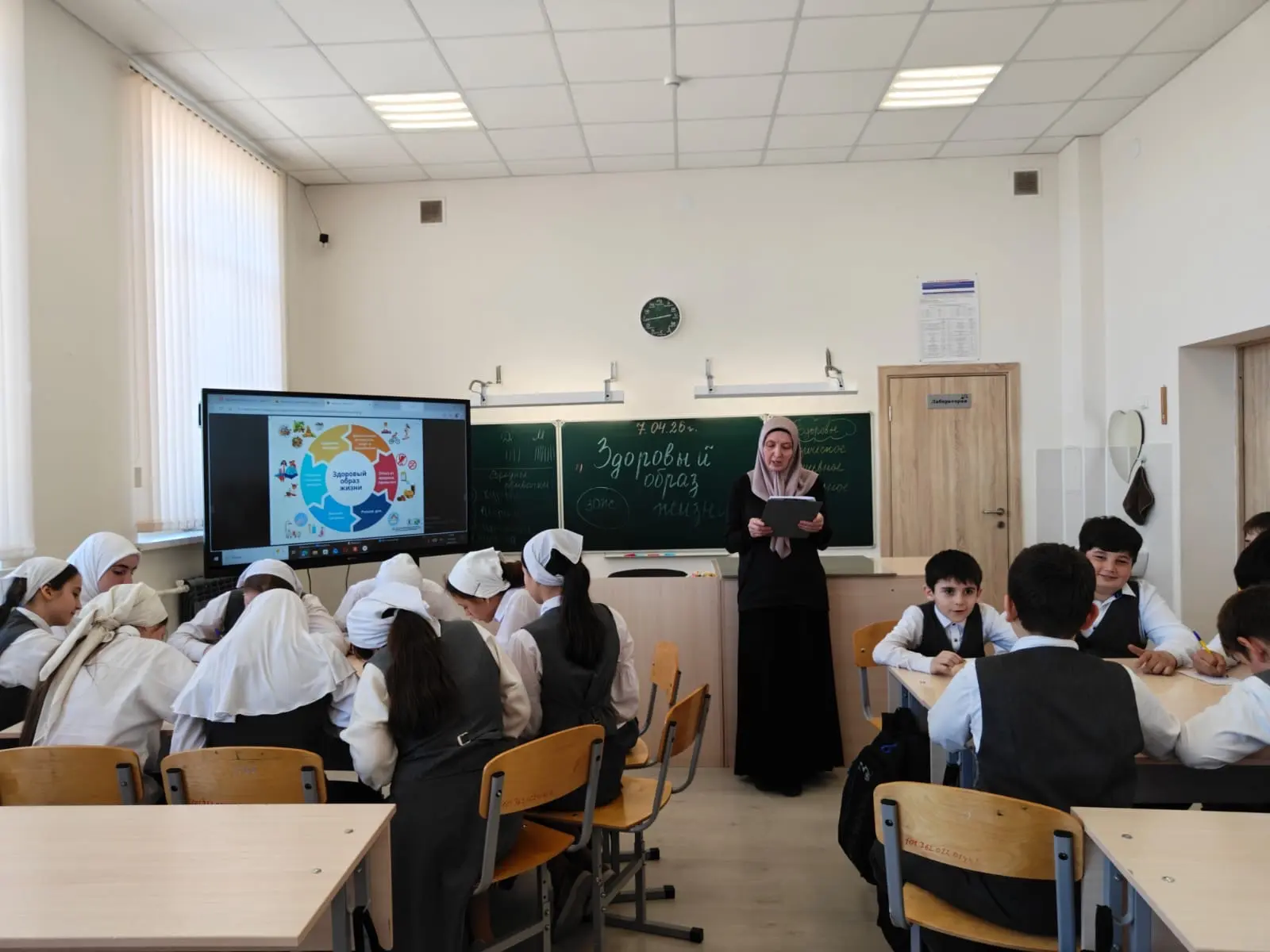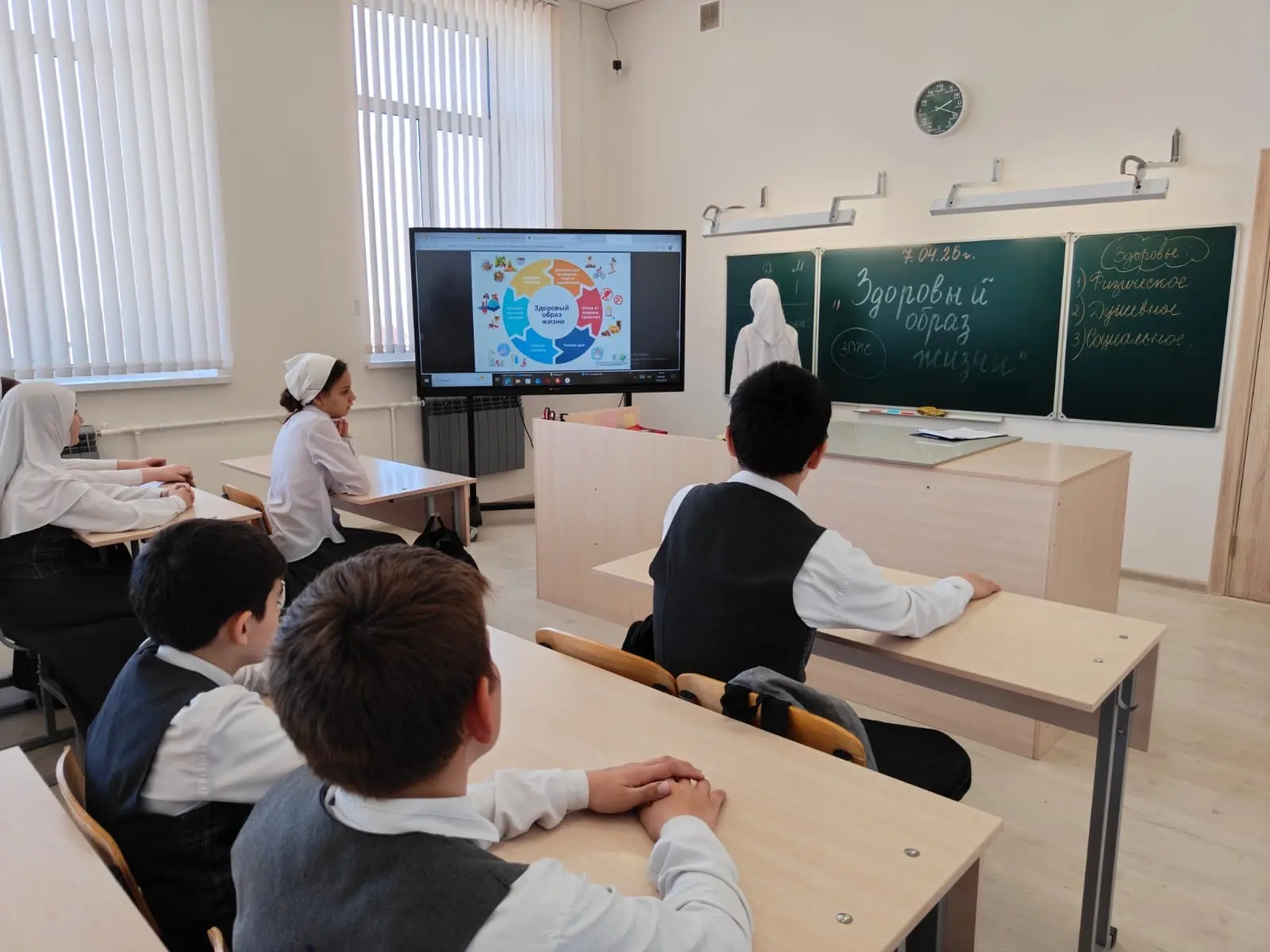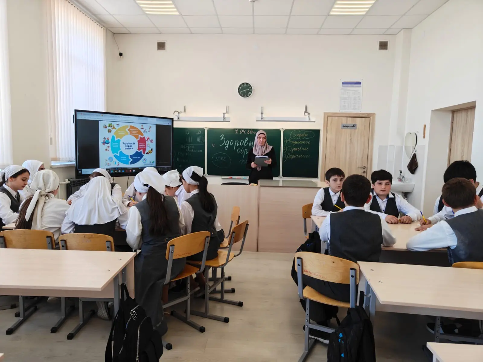 03.04.2026 в МБОУ «Новотерская СОШ им. Э. Хамидова» в 6в классе под руководством классного руководителя Махтиевой М. Ю. прошёл классный час на тему «День здоровья». В ходе мероприятия учащиеся обсуждали важность здорового образа жизни, правила правильного питания, гигиены и двигательной активности. Были проведены игровые задания и беседы, направленные на развитие заботы о собственном здоровье.