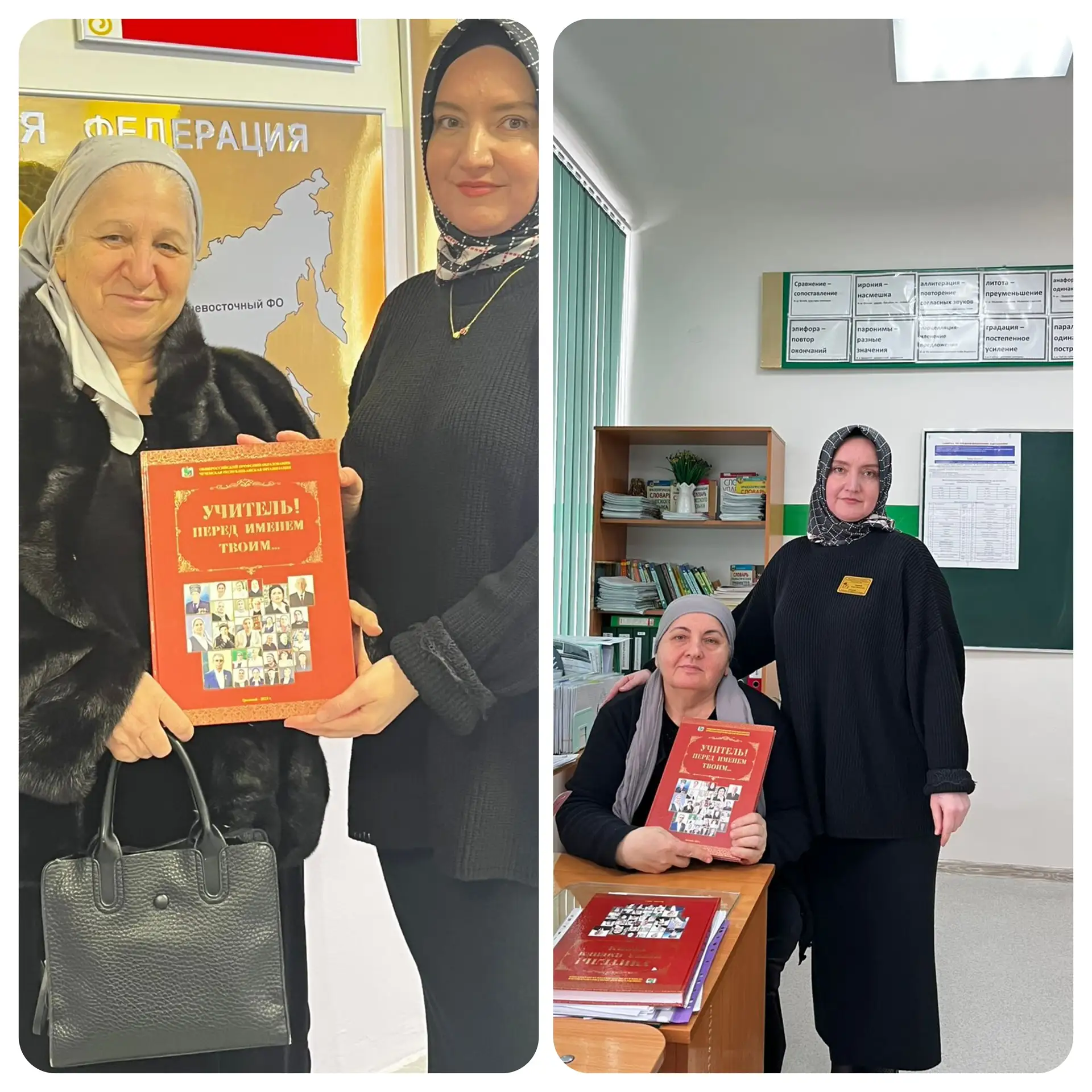 В знак глубокого уважения и признательности за Ваш многолетний труд, преданность профессии и активное участие в жизни коллектива мы вручаем Вам эту книгу «Учитель, перед именем твоим!».