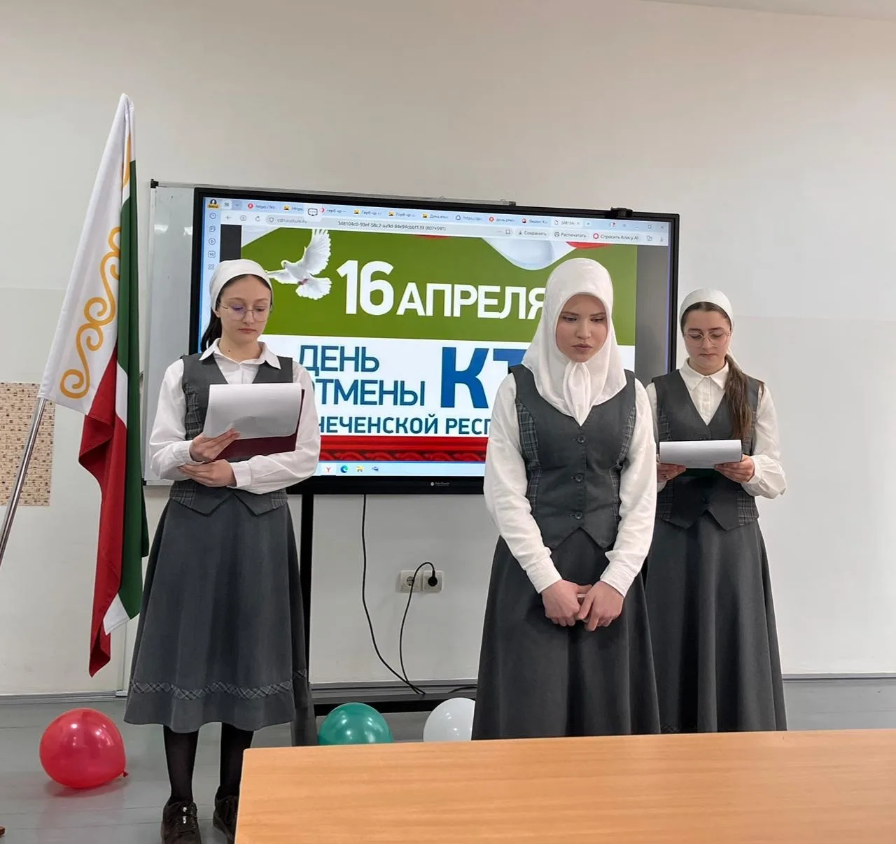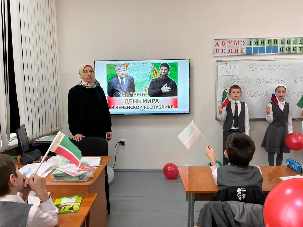 В МБОУ "СОШ 1 с.Алхазурово им. А. Сулейманова"в рамках празднования Дню Мира - Дня отмены КТО в Чеченской Республике проведены тематические классные часы и праздничные мероприятия.В этом году исполняется 17 лет со дня отмены режима контртеррористической операции.