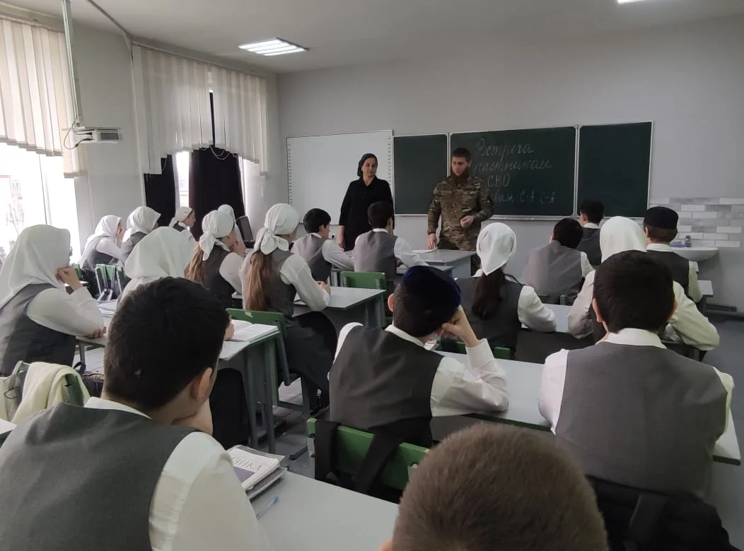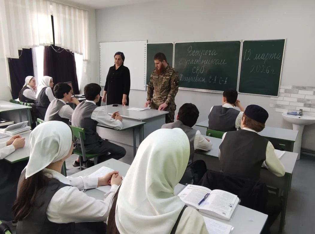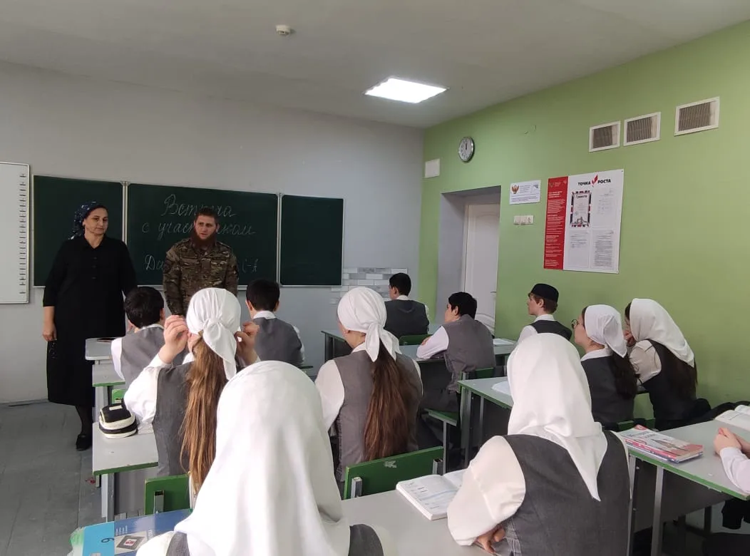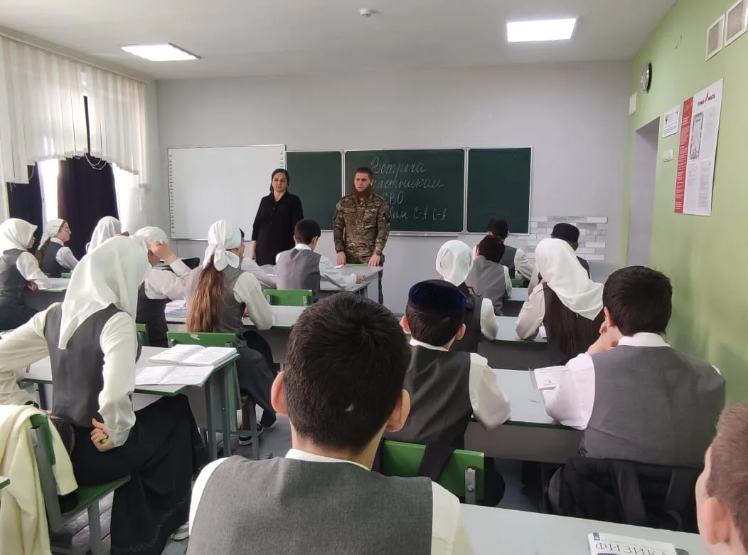 В МБОУ"СОШ№1 с. Алхазурово им. А. Сулейманова" 12 марта 2026 г. была организована встреча обучающихся 9-11 классов с участником СВО Дацаевым Сайд- Ахмедом. " Цели мероприятия : Знакомство с реалиями военной службы, развитие чувства сопричастности к истории страны. "Разговор о главном"- так можно назвать эту встречу. Это была живая беседа Героя- участника СВО с учащимися. Гость рассказал о выборе своего пути, о воинском долге и современных технологиях ведения боя. Сайд- Ахмед в период мобилизации в 2022 году одним из первых направился в зону боевых действий. Имеет боевые награды. Награжден медалью"За отвагу" Указом Президента Российской Федерации от 19 декабря 2022 года.Нагржден медалью"Участник военной операции"от 14 апреля 2025 года. В беседе Сайд- Ахмед рассказал детям, как наши бойцы, рискуя жизнью, выполняют свой воинский долг. Гость говорил о ценности человеческой жизни, о том, что значит -защищать свой дом, свою семью. В свою очередь директор школы Тасуева Л. С . поблагодарила гостя за "Урок Мужества".