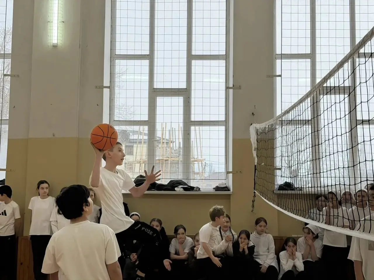 В понедельник в нашем спортзале было жарко — и не от батарей, а от накала страстей! Пятиклассники устроили настоящий турнир по пионерболу, разделившись на две непримиримые команды: мальчики против девочек.