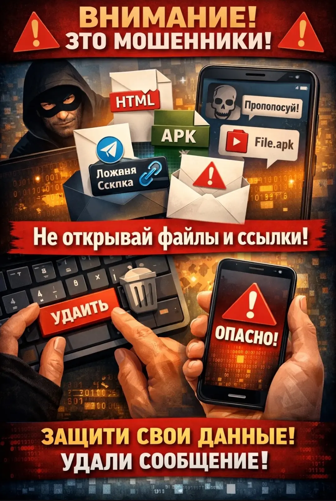 Если Вы получили сообщение с приложением файла в формате html, в формате apk, ссылки для перехода в Телеграмм или на иной ресурс (сайт)