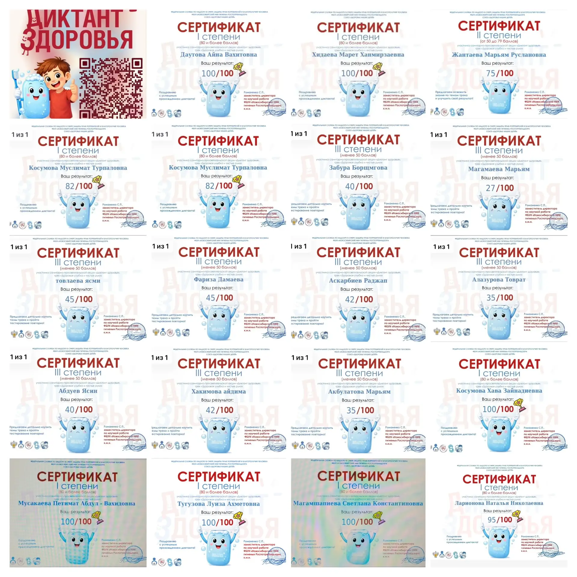После успешного выполнения заданий все участники получили именные сертификаты, подтверждающие участие во Всероссийской акции. Подобные мероприятия помогают не только оценить уровень санитарно-гигиенической грамотности, но и мотивируют к соблюдению правил здорового образа жизни.