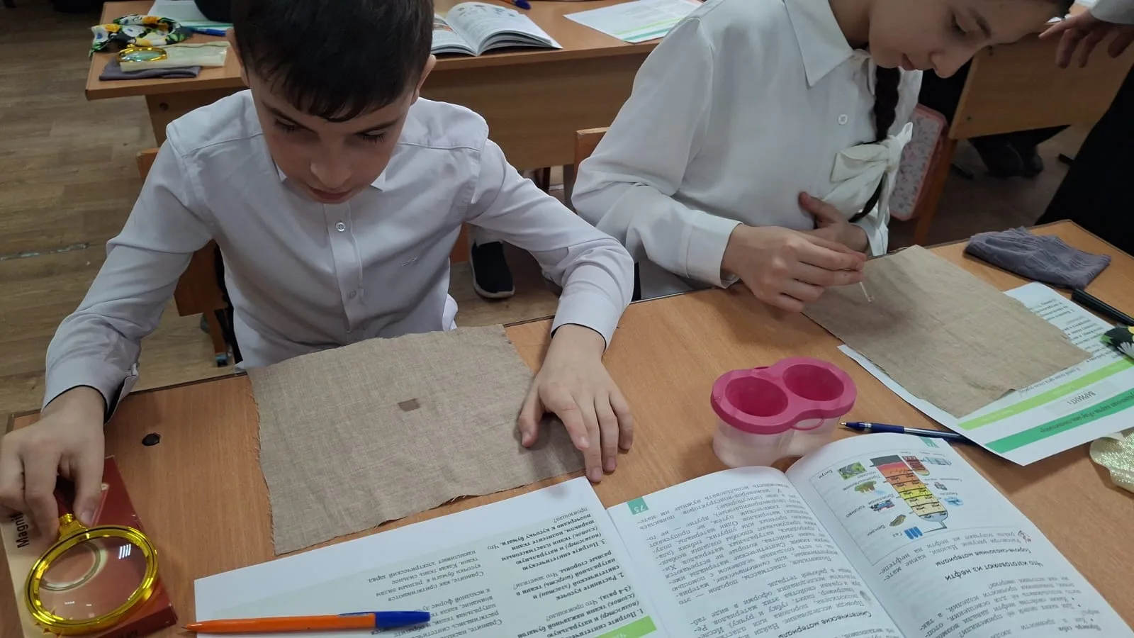Учитель начальных классов Магомедова Залина Ризвановна на уроке технологии рассказала и показала свойства синтетических тканей,провела несколько опытов вместе с детьми для определения свойств тканей.