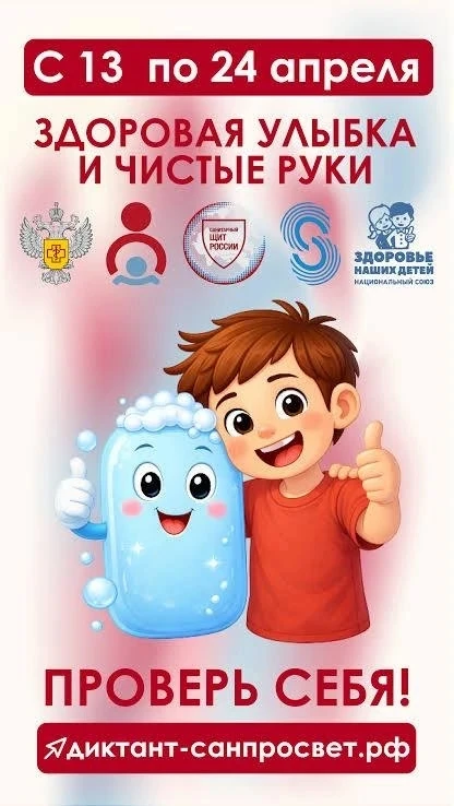 В рамках реализации коммуникационной стратегии «Санпросвет» Роспотребнадзора и межрегионального проекта «Сибирская школа — территория здоровья» с 13 по 24 апреля 2026 года проводится Всероссийская санитарно‑просветительская акция «Диктант здоровья — здоровая улыбка и чистые руки».