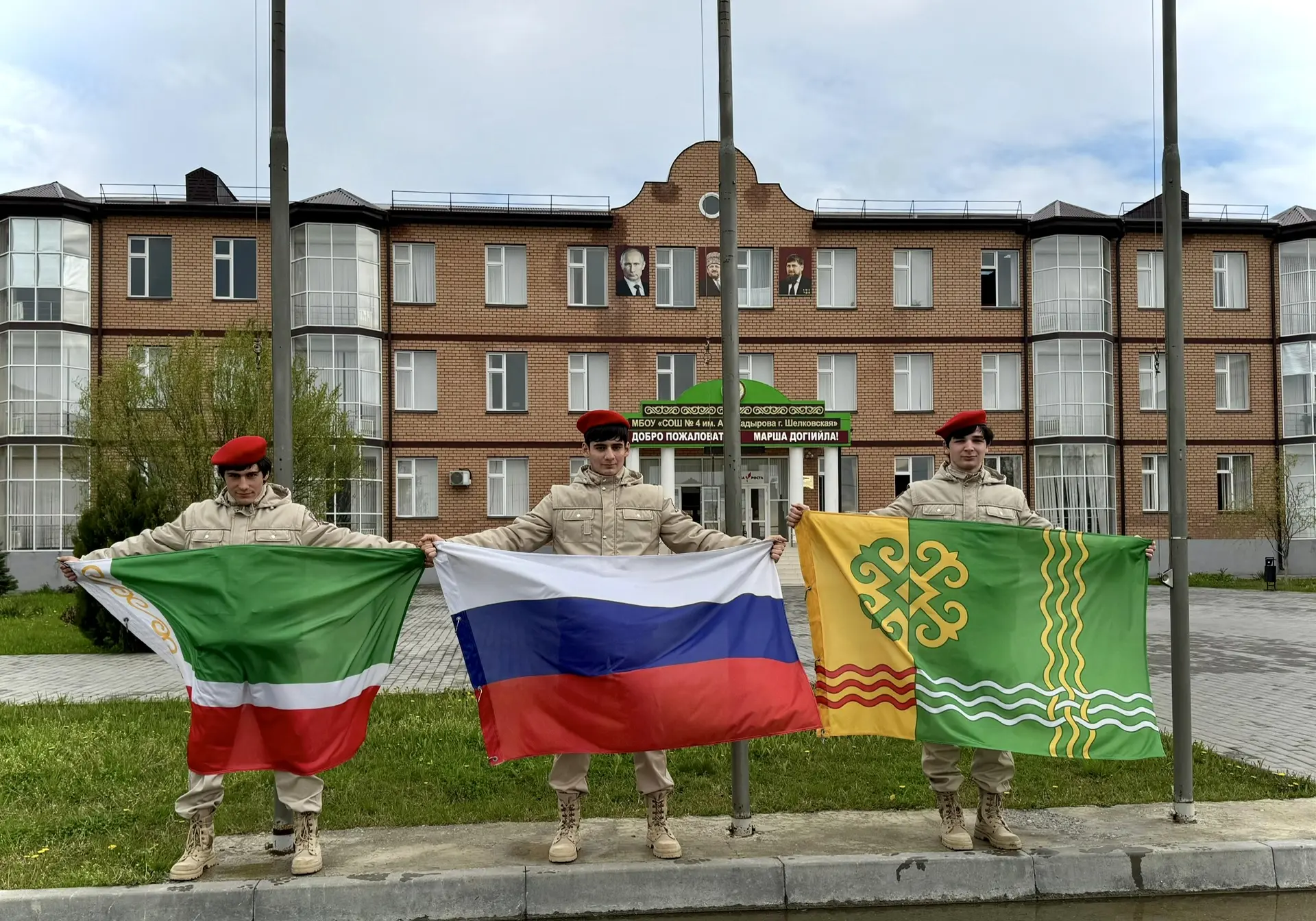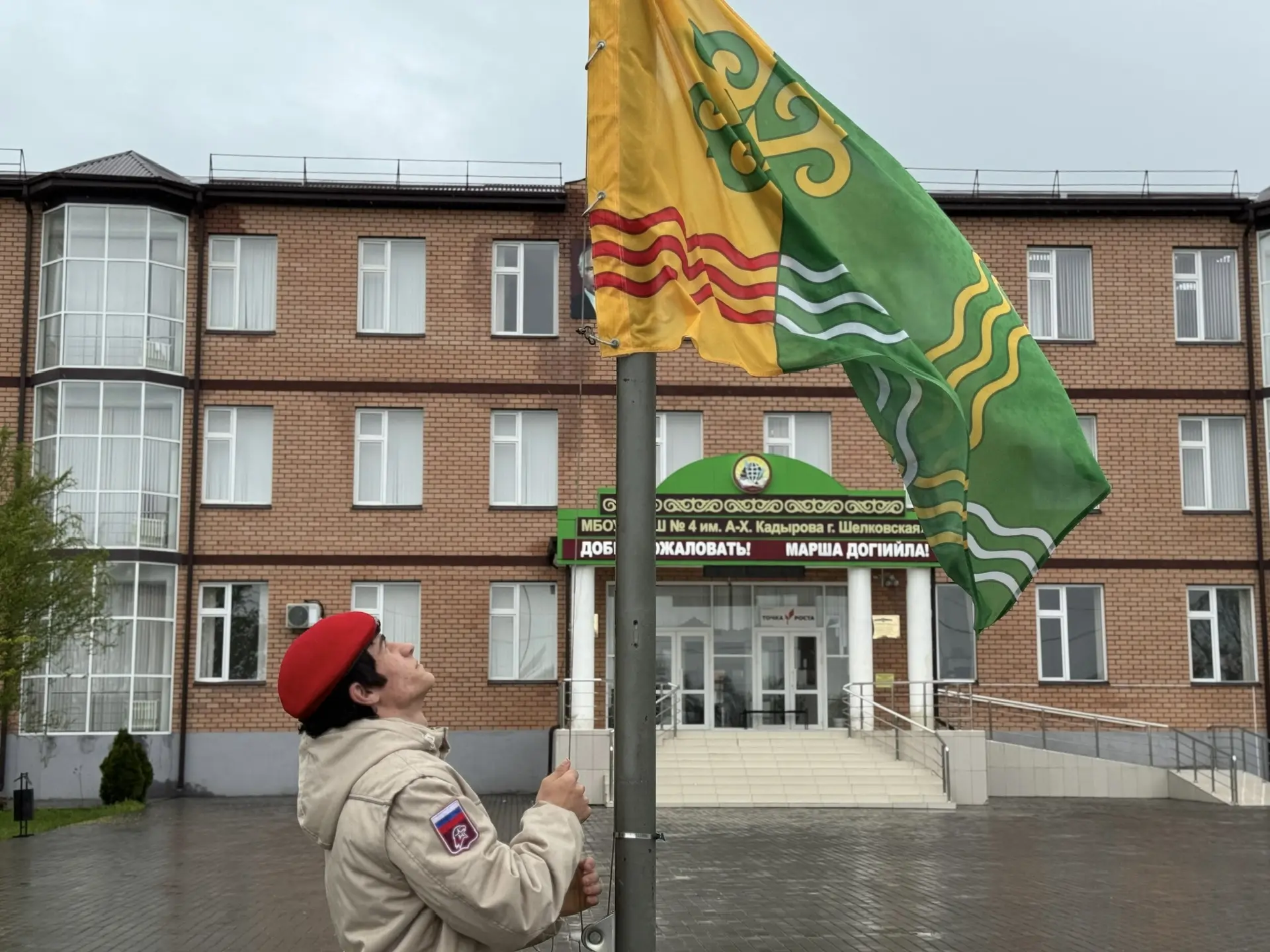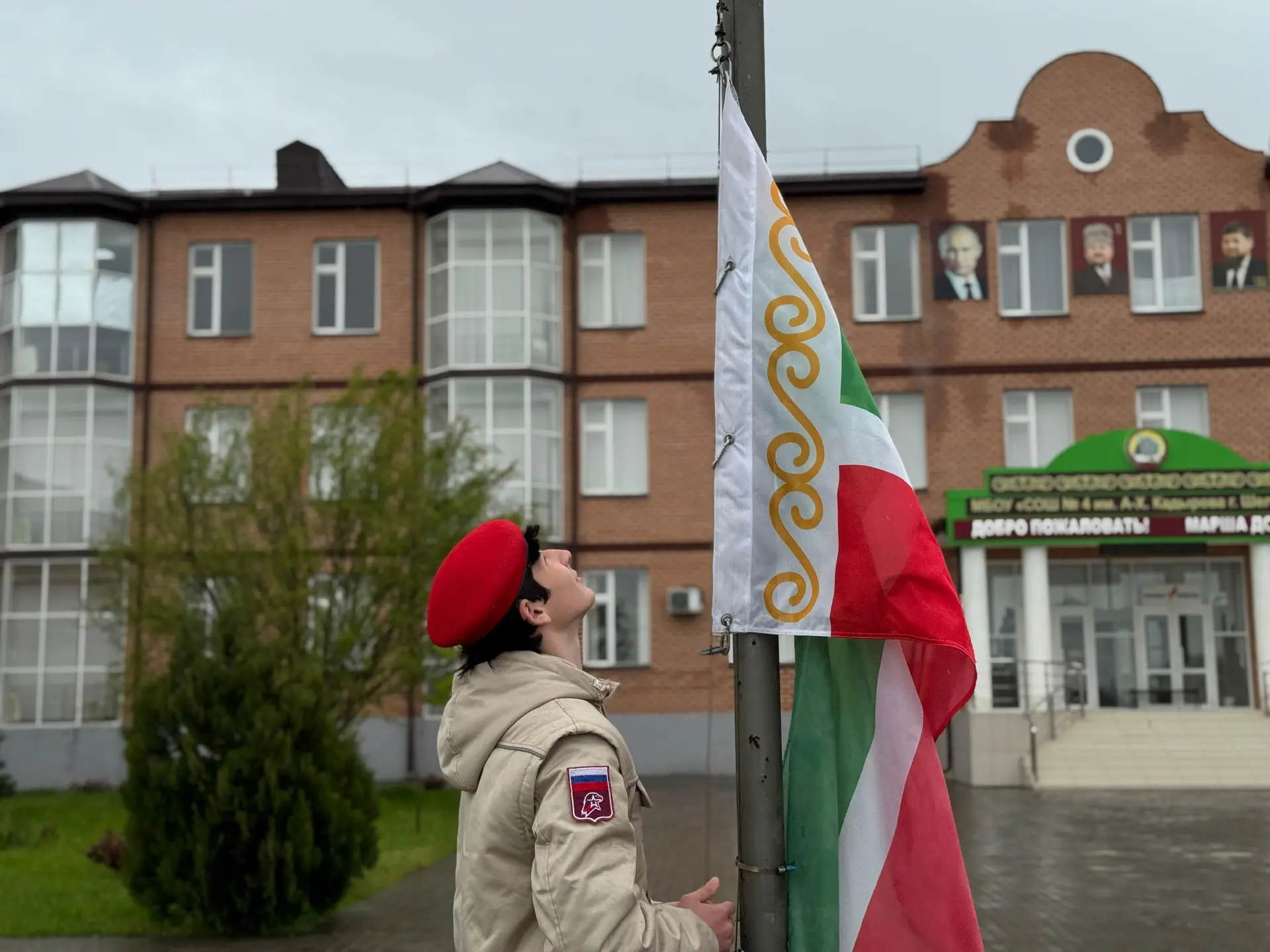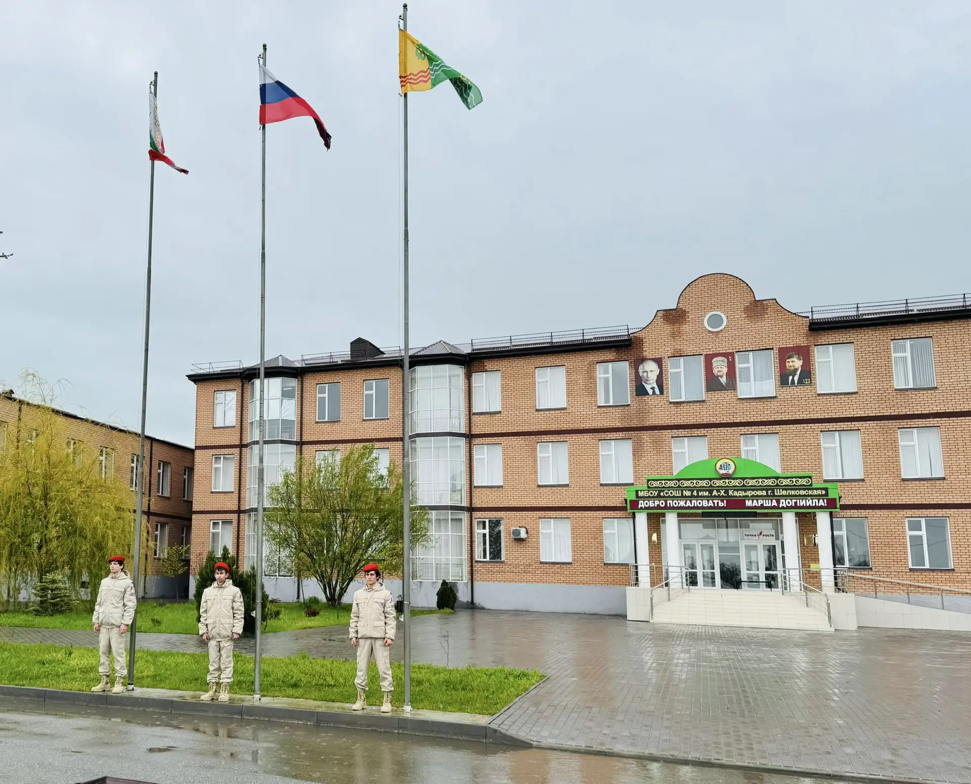 Каждую неделю в МБОУ «СОШ №4 им.А-Х. Кадырова г.Шелковская» торжественно поднимается триколор под звуки гимна.
