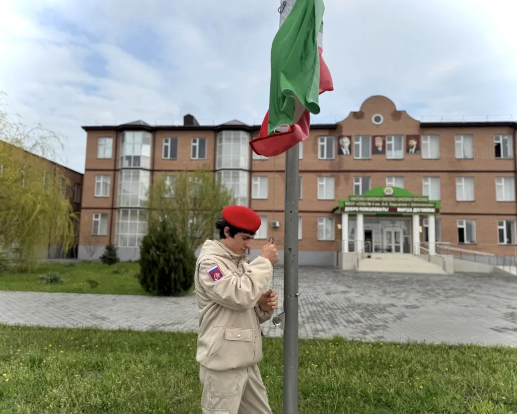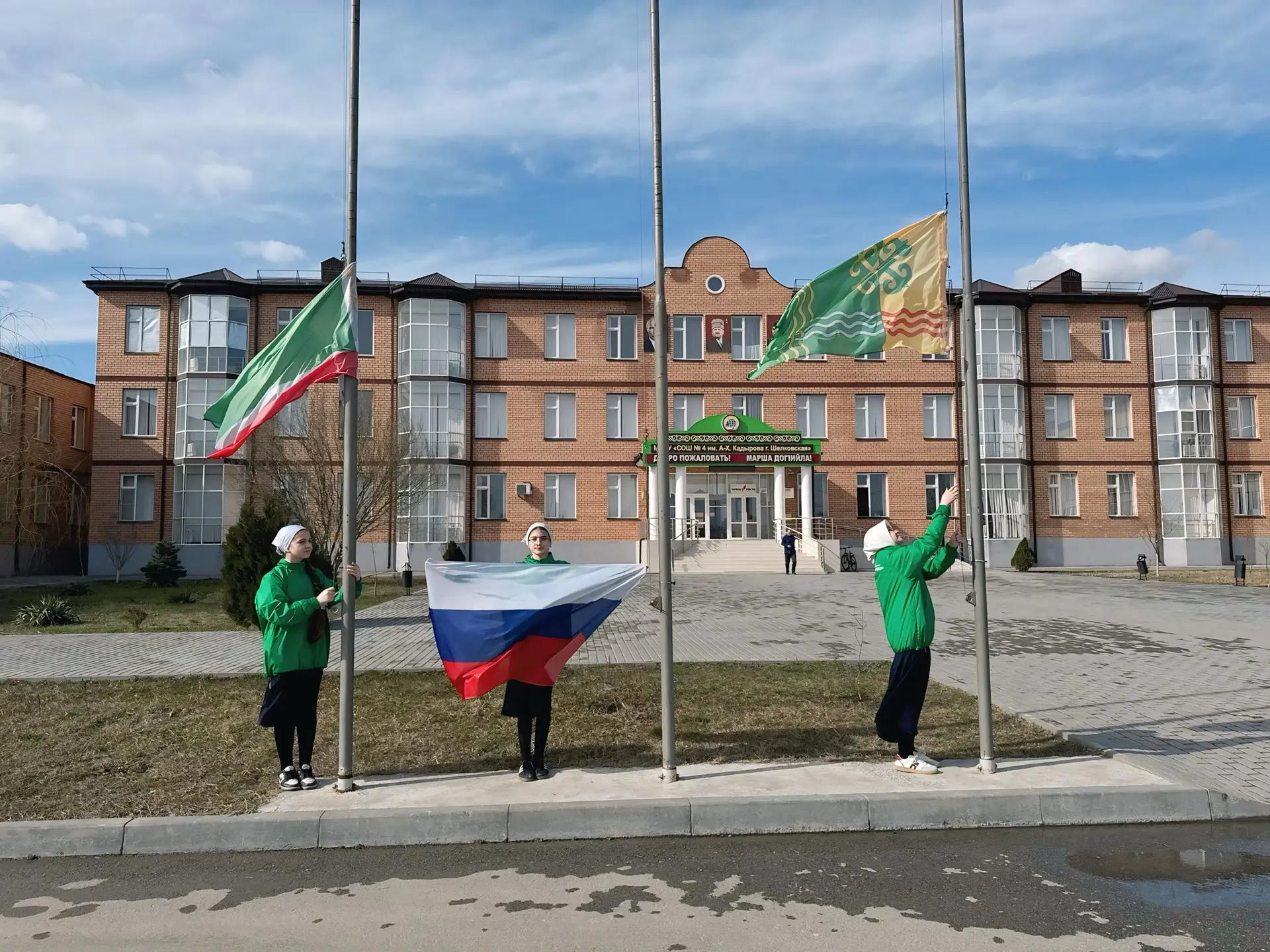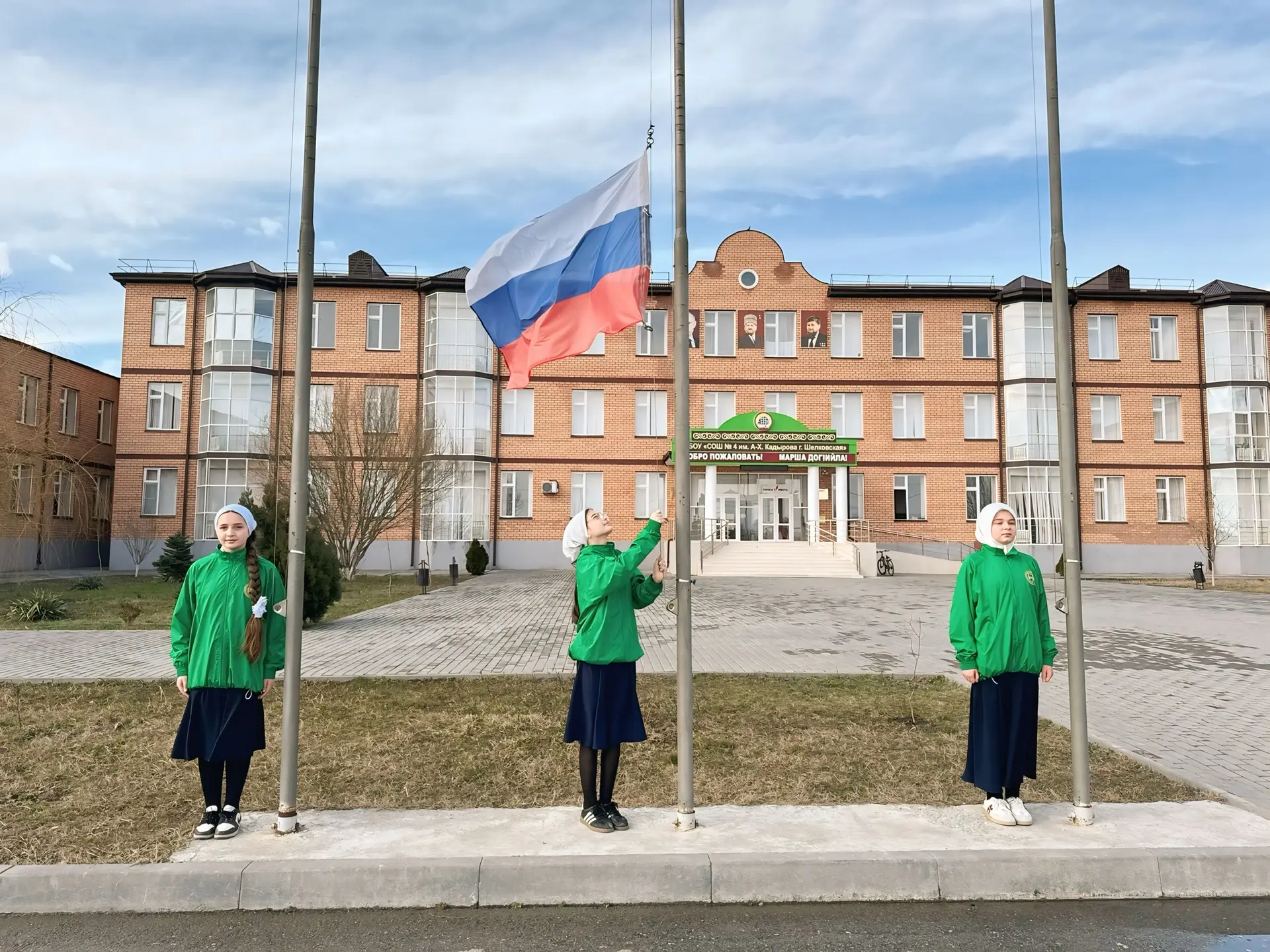 В МБОУ СОШ№4 им.А-Х. Кадырова г. Шелковская» неделя начинается с особого события — торжественного подъёма Государственного флага Российской Федерации.