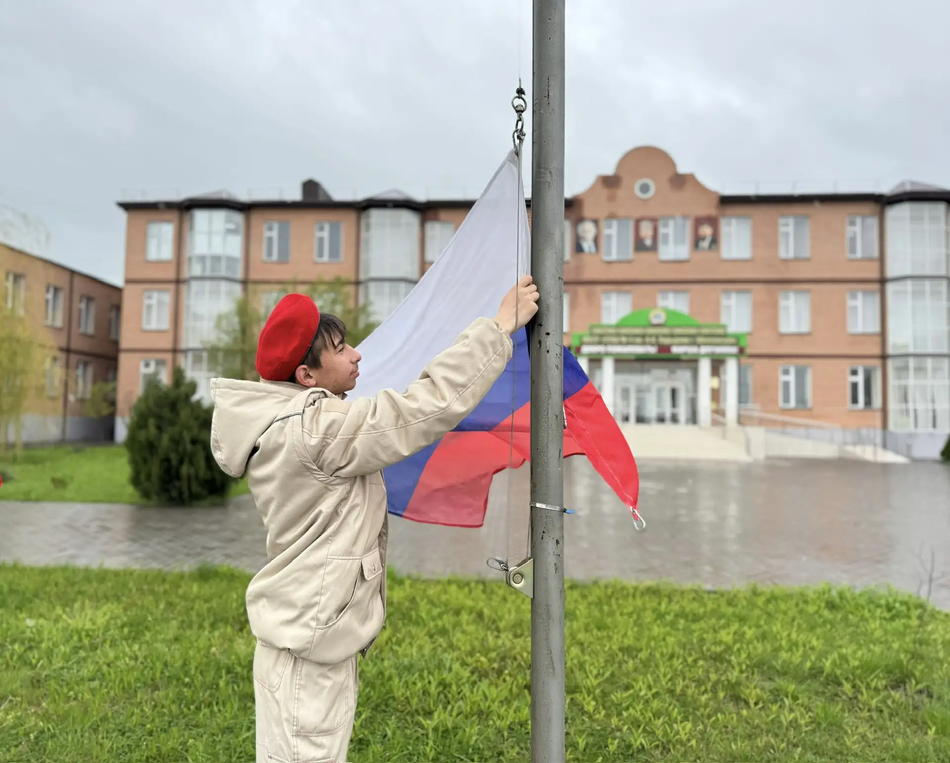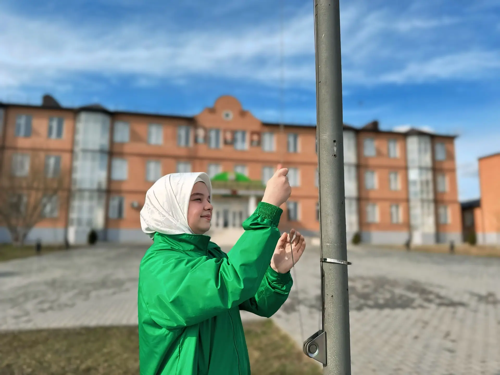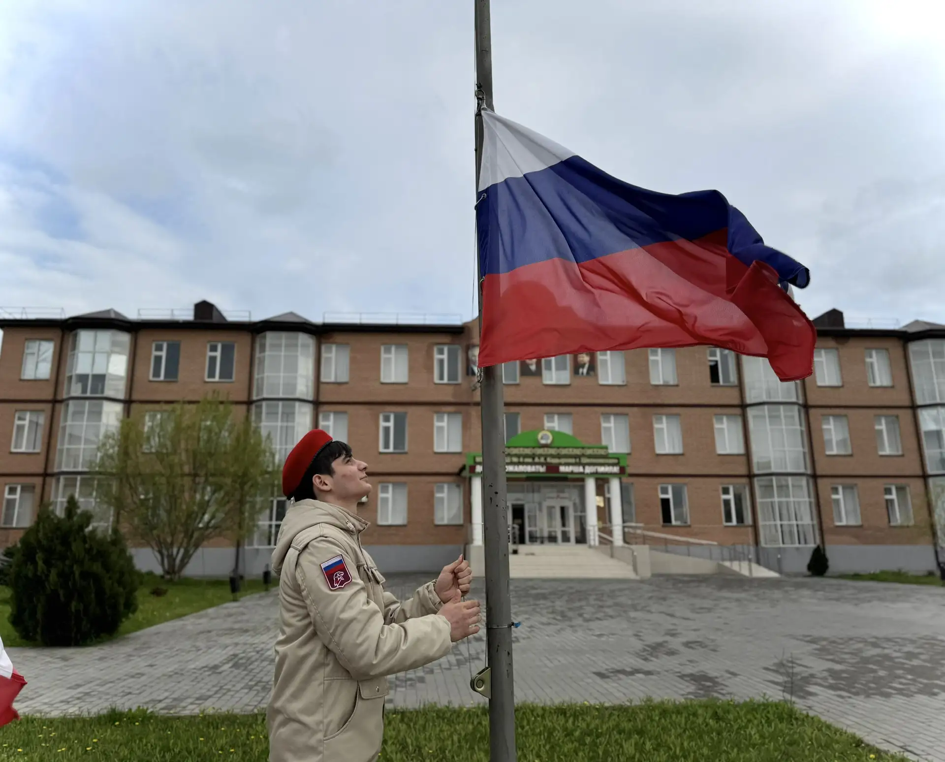 В МБОУ СОШ№4 им.А-Х. Кадырова г. Шелковская» неделя начинается с особого события — торжественного подъёма Государственного флага Российской Федерации.