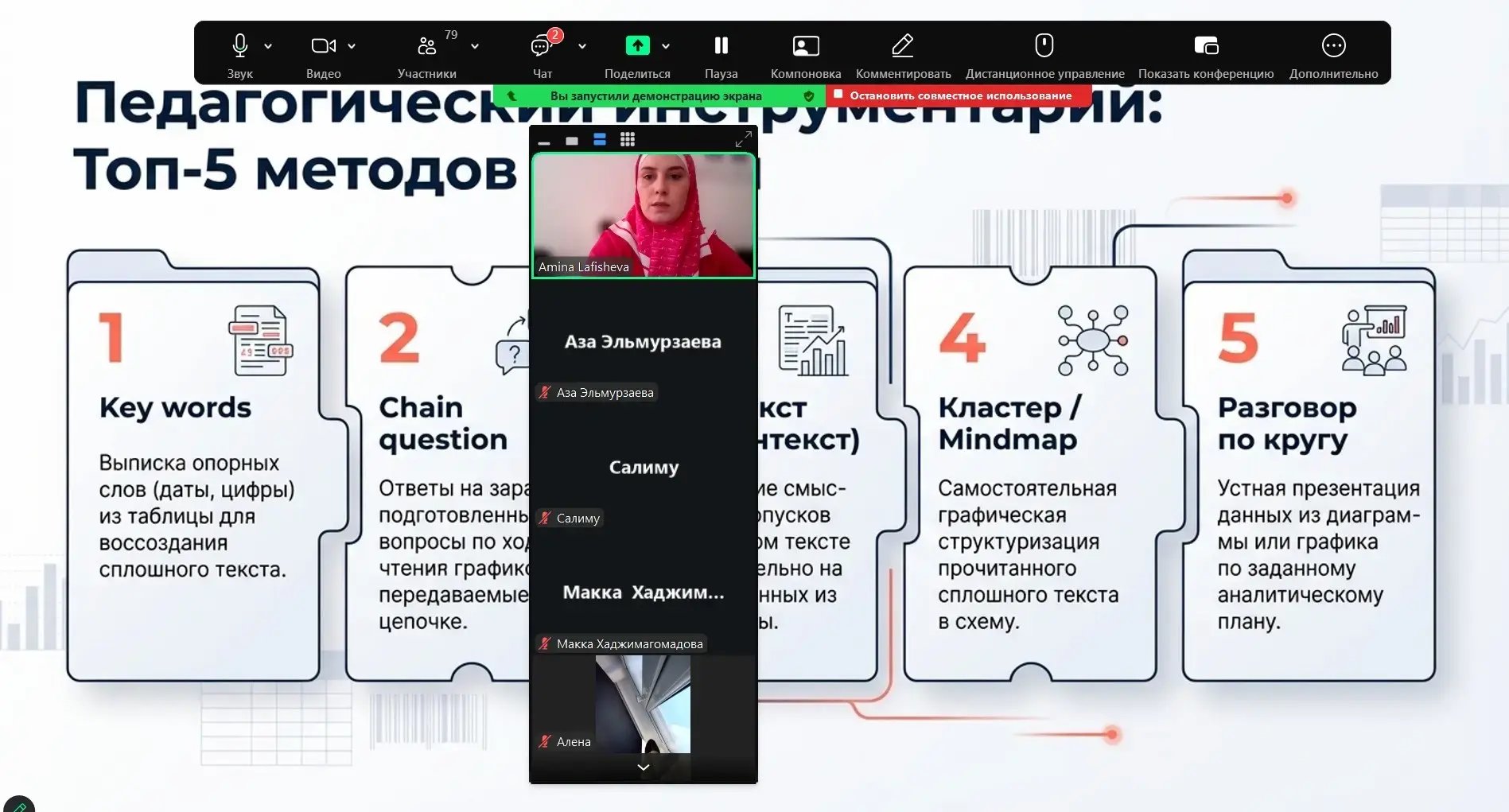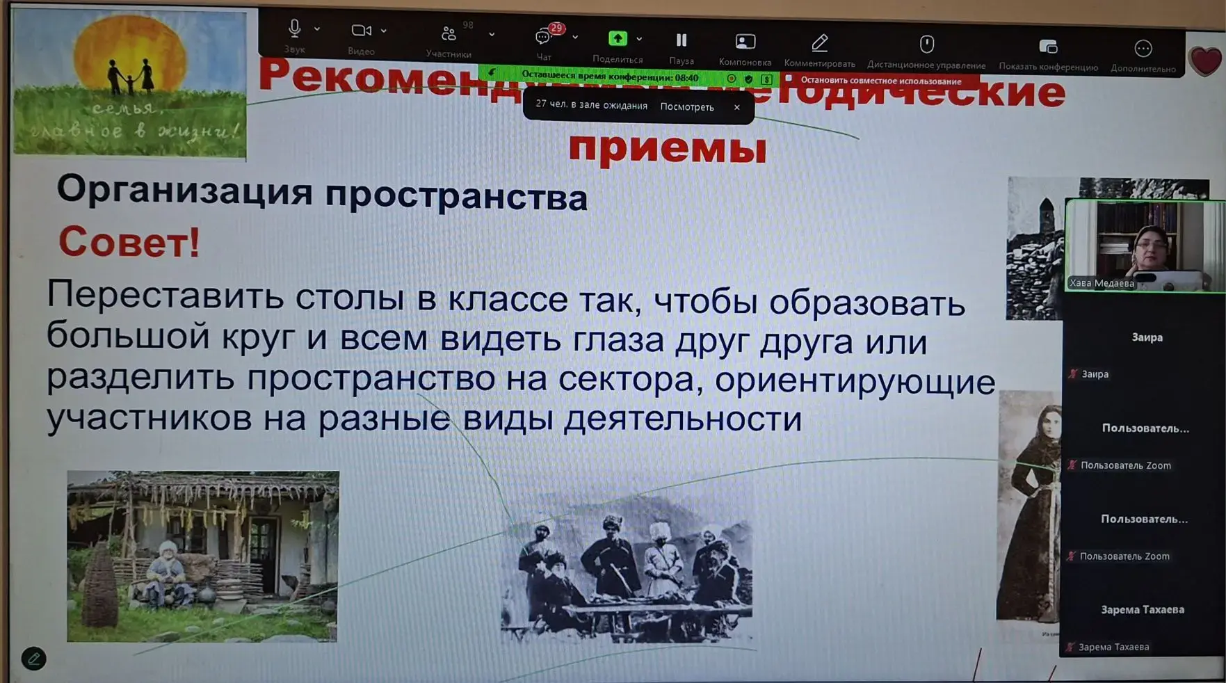 В ходе вебинара были освещены следующие вопросы: приоритеты государственной политики по сохранению и укреплению традиционных российских духовно-нравственных ценностей; роль семьи и школы в сфере укрепления межнационального, общегражданского единства, традиционных духовно-нравственных, культурно-исторических ценностей народов Российской Федерации, сохранение и уважение традиционных семейных и культурных ценностей разных народов, проживающих в Чеченской Республике; были представлены методические приемы и техники, которые помогут педагогическим работникам при проведении разнообразных мероприятий.