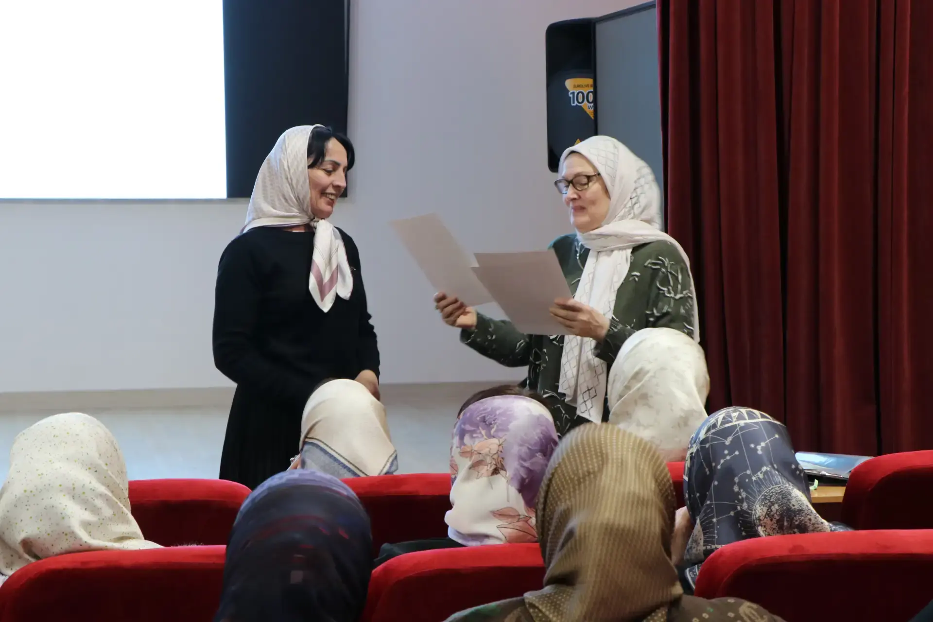 На импровизированной сцене блистал дуэт: молодой педагог ГБНОУ «РКО и ДО «Квант» Аслаханова Санет Хамидовна и её наставник — преподаватель Центра начального общего образования Ганатова Зарема Микаиловна.
