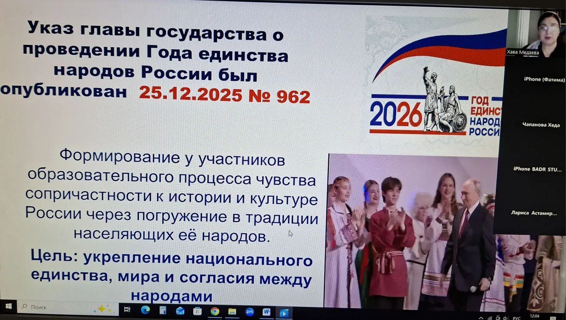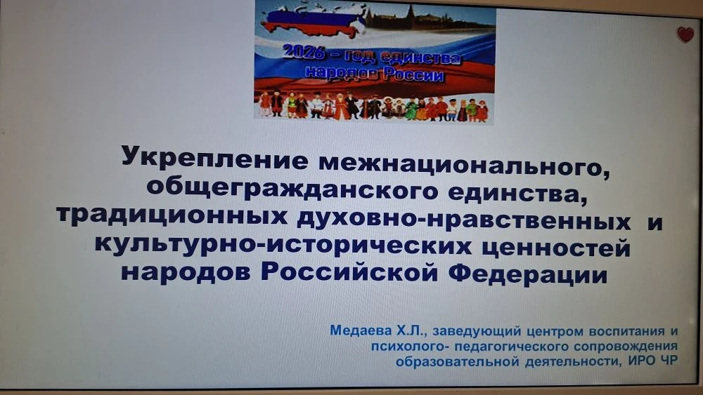 В соответствие с Указом Президента Российской Федерации В.В.Путина от 25.12.2025 № 962 «О проведении Года единства народов России» в ГБУ ДПО «Институт развития образования Чеченской Республики» прошел вебинар на тему: «Укрепление межнационального, общегражданского единства, традиционных духовно-нравственных и культурно-исторических ценностей народов Российской Федерации».