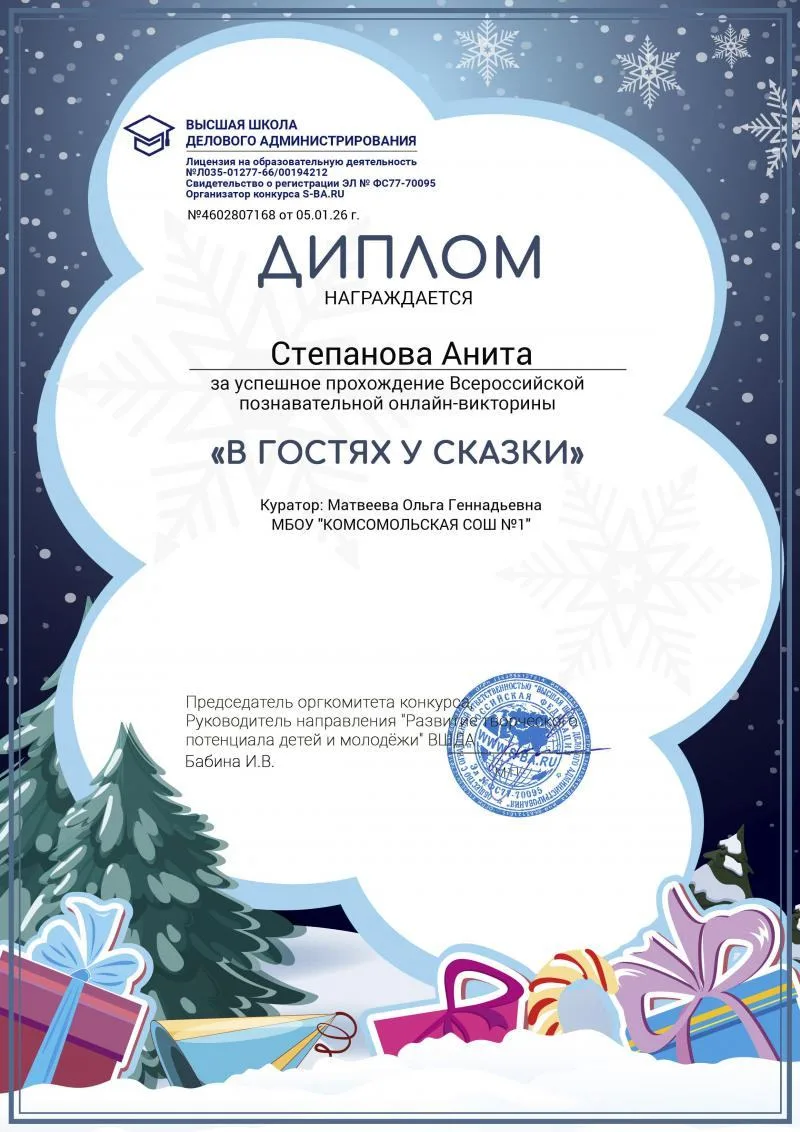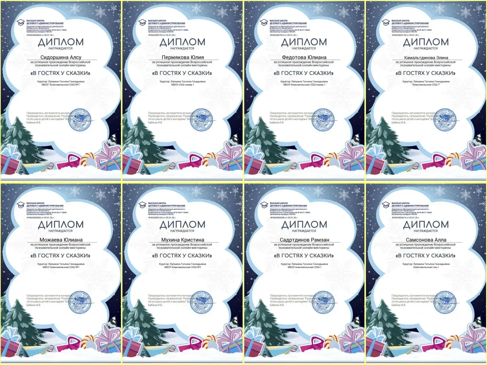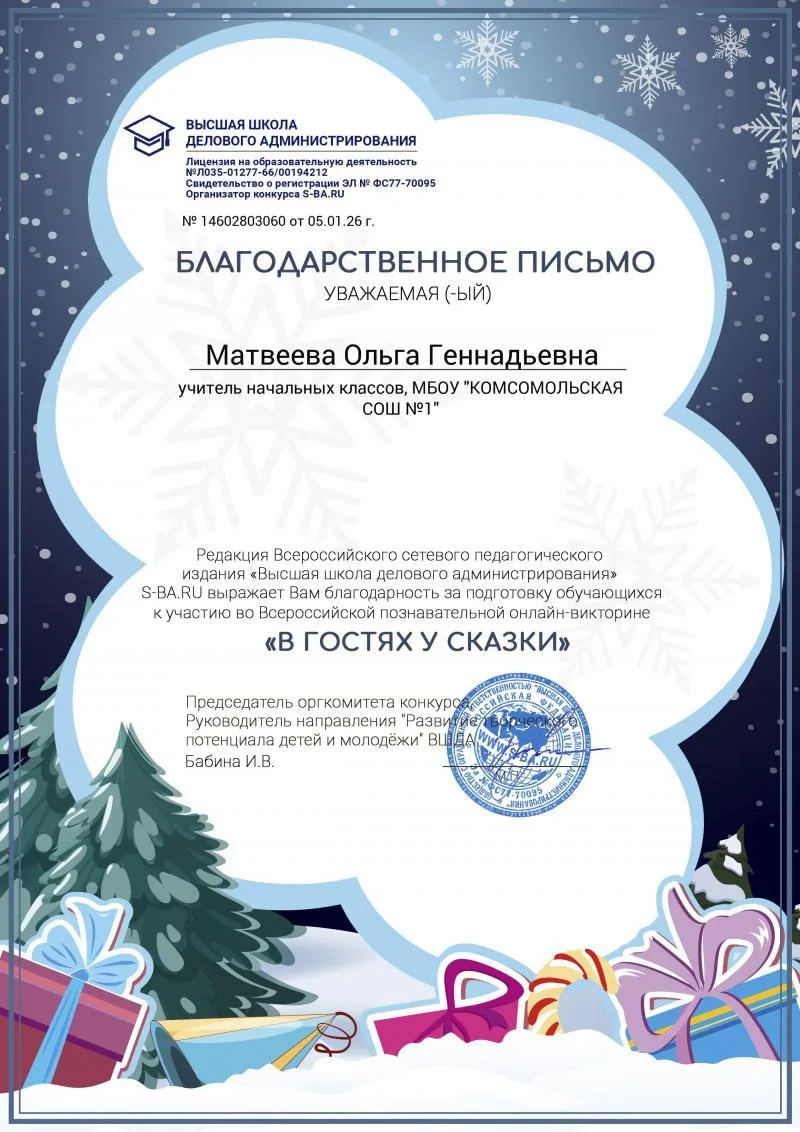 🔹Учащиеся 3 «Б» класса (классный руководитель — О.Г. Матвеева) совершили волшебное путешествие, не выходя из дома! 🖌Они приняли участие во Всероссийской познавательной онлайн-викторине «В гостях у сказки», организованной Высшей школой делового администрирования.