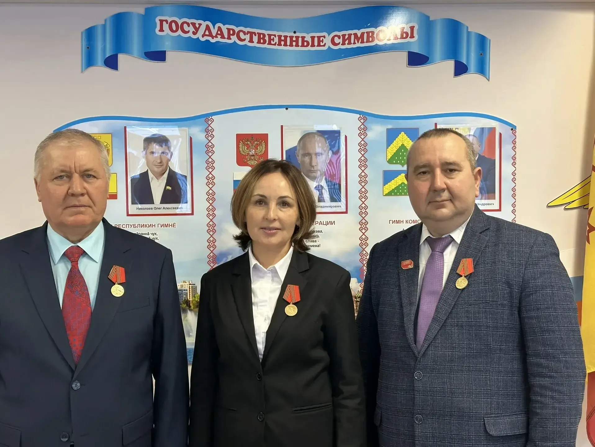 🔺✨Высокая честь для педагогов : Глава Комсомольского муниципального округа Н.Н. Раськин вручил юбилейные медали «80 лет Победы в Великой Отечественной войне» за вклад в патриотическое воспитание директору школы Ирине Алексеевне Соловьевой , заместителю директора Николаю Алексеевичу Атласкину и советнику директора Петру Васильевичу Родионову .