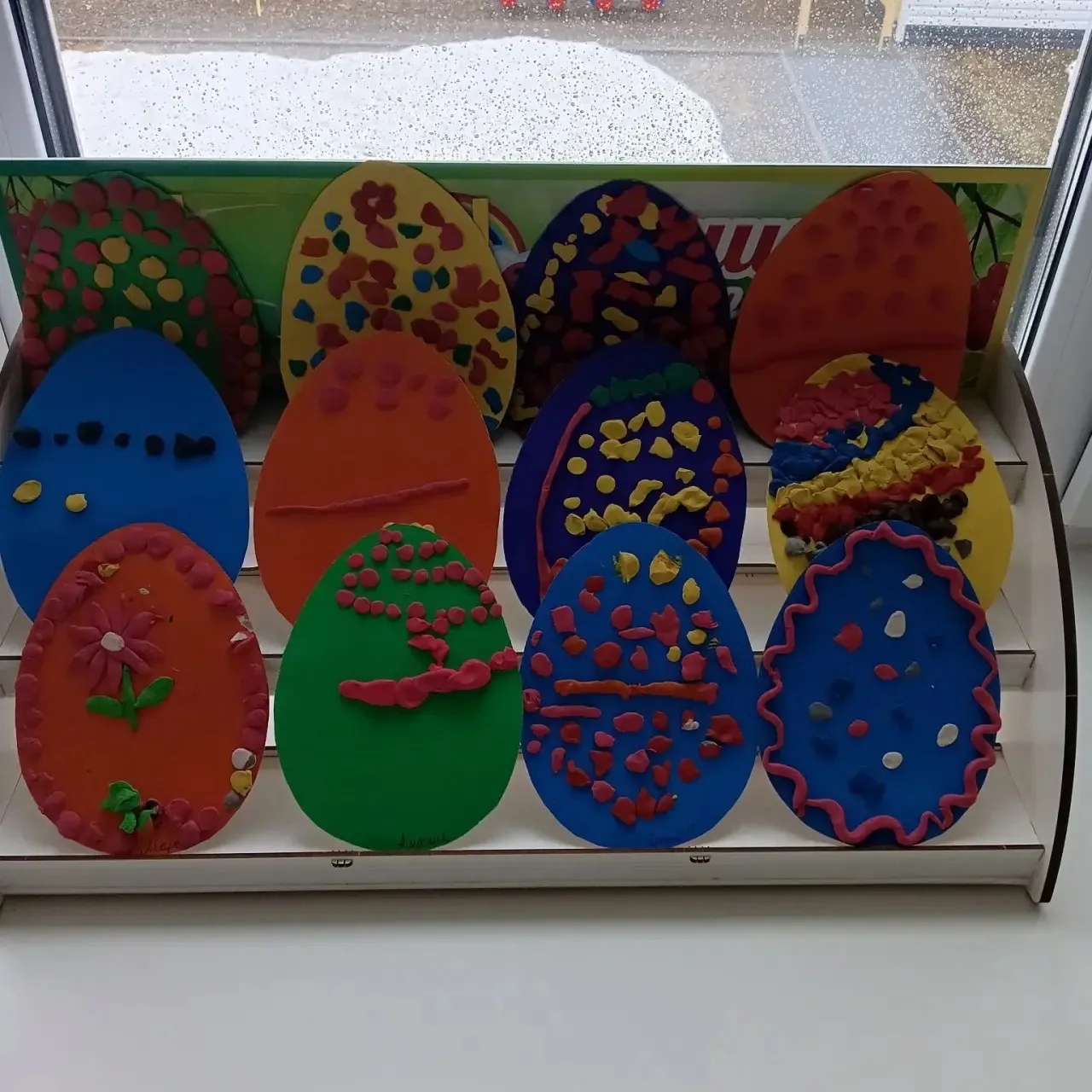 После этого ребята вместе создали удивительные поделки: яркие пасхальные яйца из картона, украшенные пластилином .