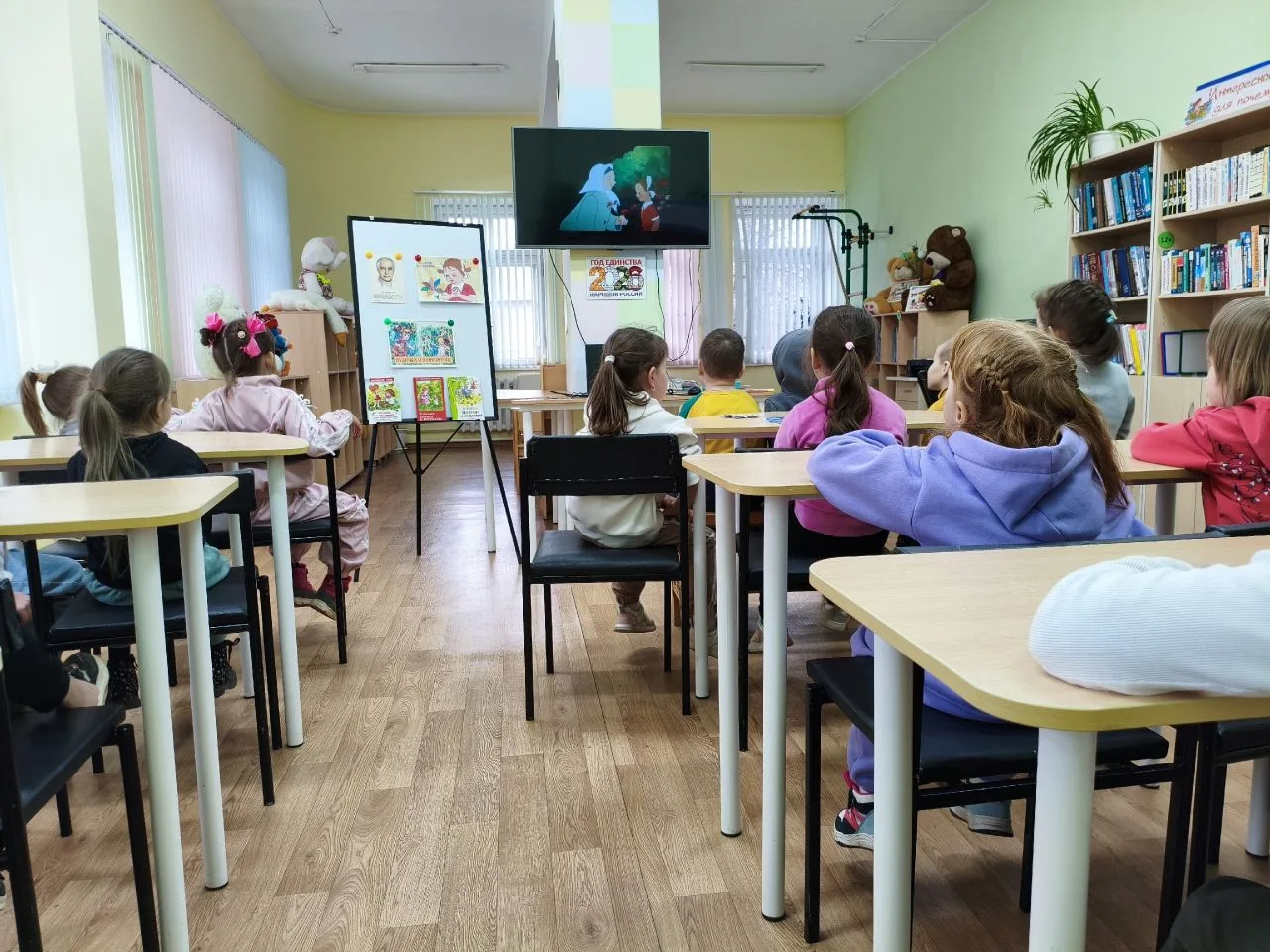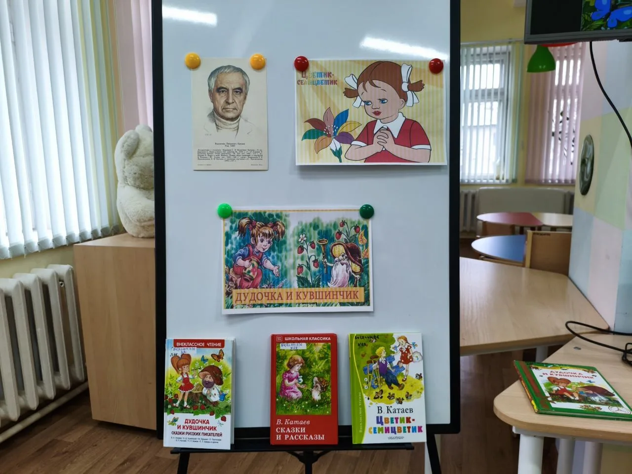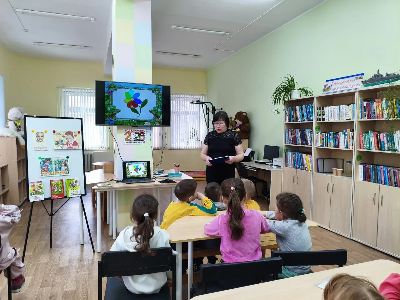 Сегодня наши воспитанники из группы «Ягодка» побывали в библиотеке им. П. Хузангая! 📚 Библиотекарь провела для ребят увлекательный литературный урок «Поляна сказок Валентина Катаева».