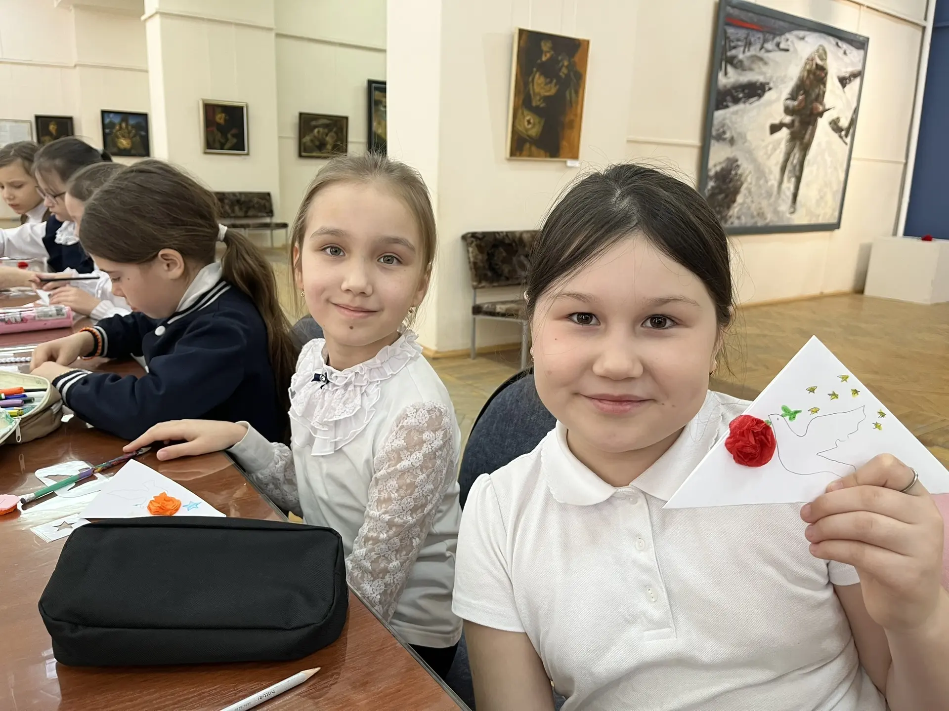 На занятии ребята посмотрели выставку картин, посвящённых войне, а также небольшой фильм о работе медсестры в военное время 👩⚕️.