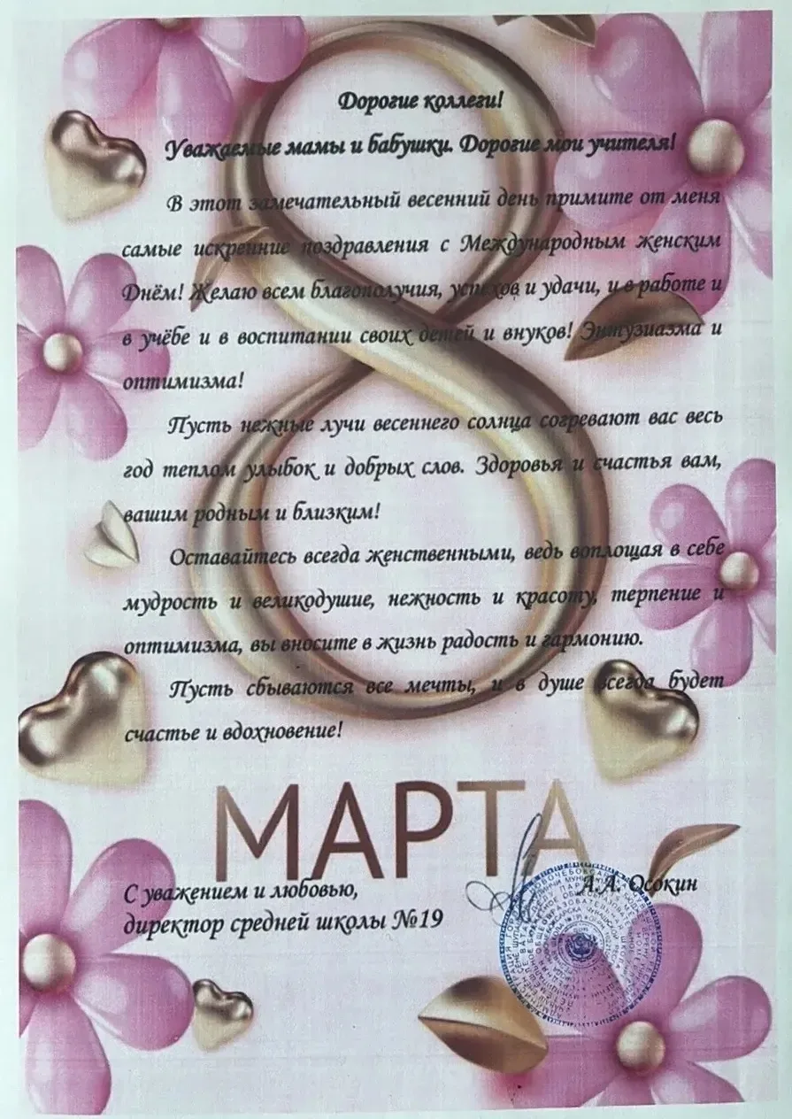 Сегодня вся наша большая школьная семья празднует Международный женский день. 8 Марта — это праздник, когда вся природа замирает в ожидании тепла, а наши сердца наполняются особой благодарностью к вам, дорогие женщины!