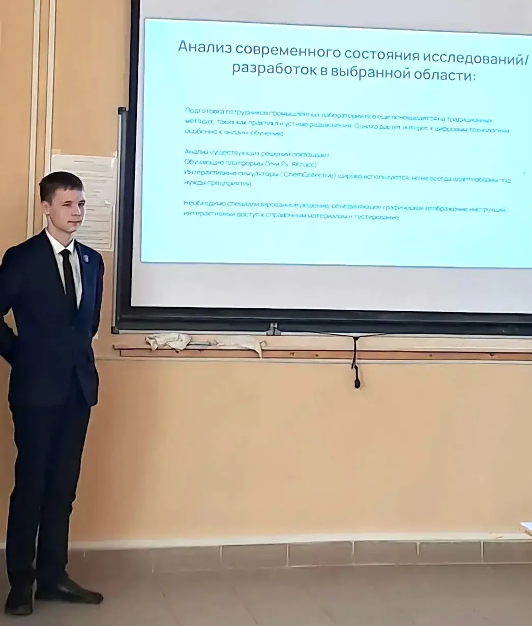 👨🏼💻Артём выступил в секции «Первые шаги в ИТ» факультета информатики и вычислительной техники со своим проектом: «Разработка пользовательских сценариев для проекта Химпром: Помощник лаборанта» ⚗️. Его работа посвящена созданию удобных сценариев взаимодействия для цифрового помощника, который упрощает повседневные задачи лаборантов в химической промышленности.