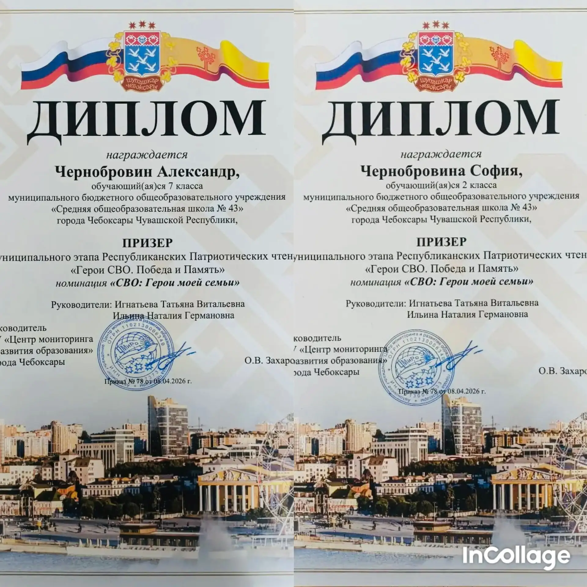 Обучающиеся нашей школы Чернобровин Александр (7 «Г») и Чернобровина София (2 «Б») представили свою работу «Наш папа, Чернобровин Вячеслав Олегович, - герой» в номинации «СВО: Герои моей семьи»