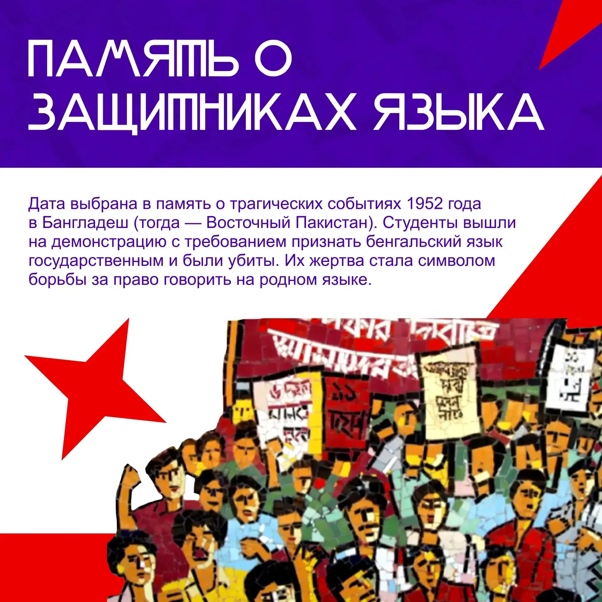 Дата праздника выбрана неслучайно, а в память о страшных событиях, которые произошли 21 февраля 1952 года в столице Бангладеш. В городе Дакке язык коренной народности не был призван официальным. Протестовавшие студенты вышли на городскую площадь в защиту своего родного языка бенгальского диалекта - языка урду, который они требовали признать одним из государственных языков страны. Тогда мирная акция закончилась беспорядками, пакистанская полиция для подавления восстания применила оружие, от пуль полицейских погибли студенты.