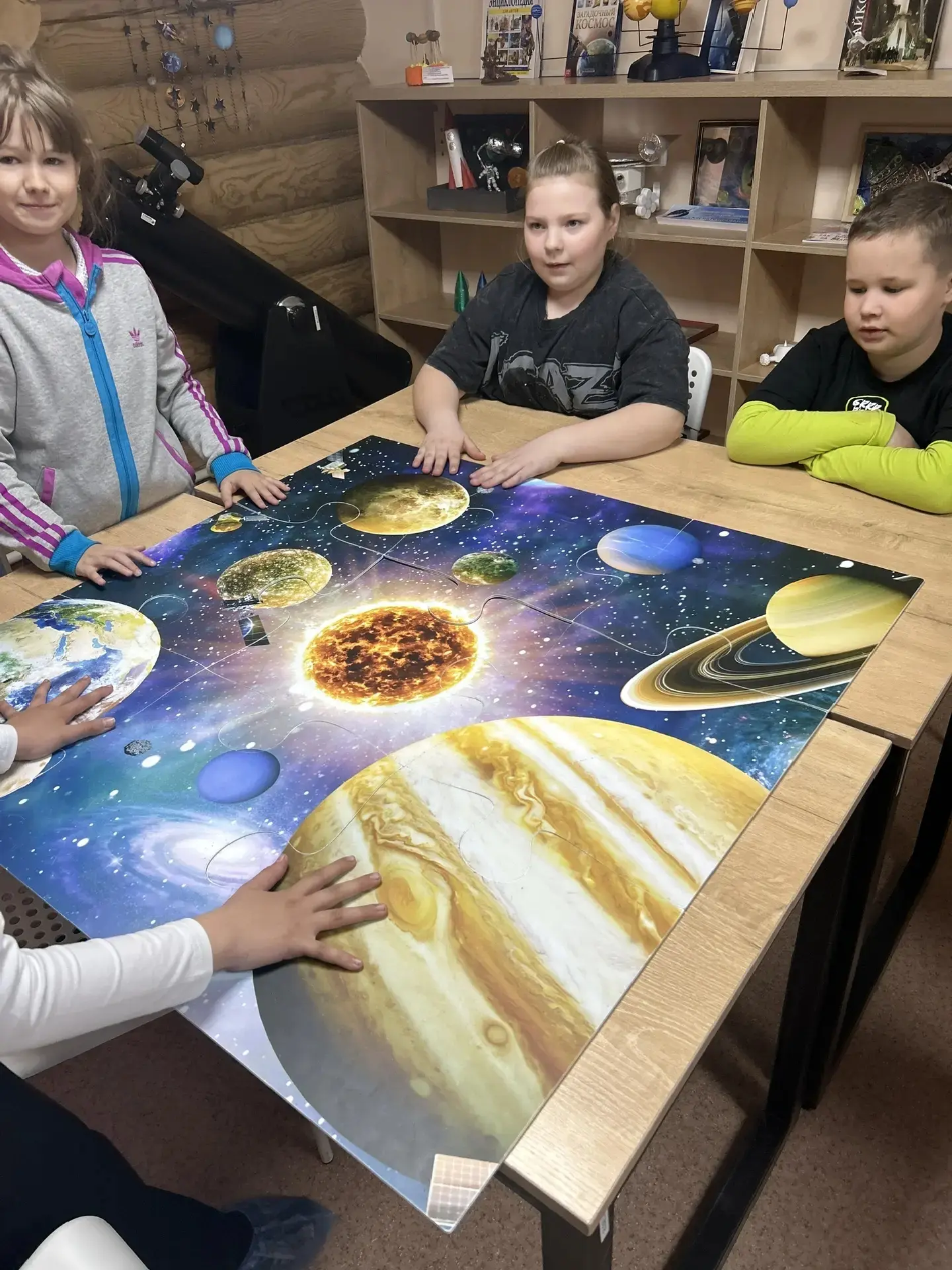 На встрече дети узнали, почему светят звёзды, посмотрели увлекательный фильм про Звёздочку и даже поиграли в интерактивные игры. 🌟 Самым захватывающим моментом стало наблюдение в настоящий телескоп и знакомство с настоящим метеоритом! 🔭