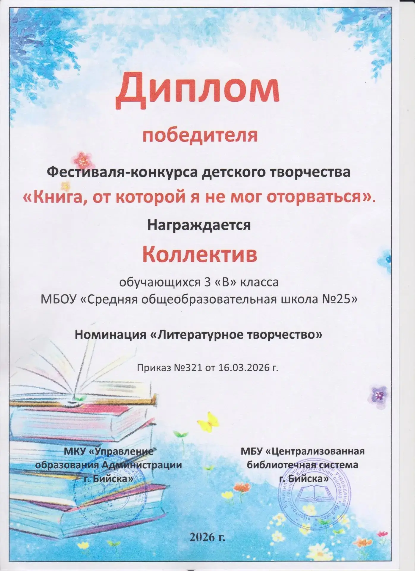 Сборник творческих работ учеников 3 «В» класса стал победителем в Городском конкурсе «Книга, от которой я не мог оторваться»!