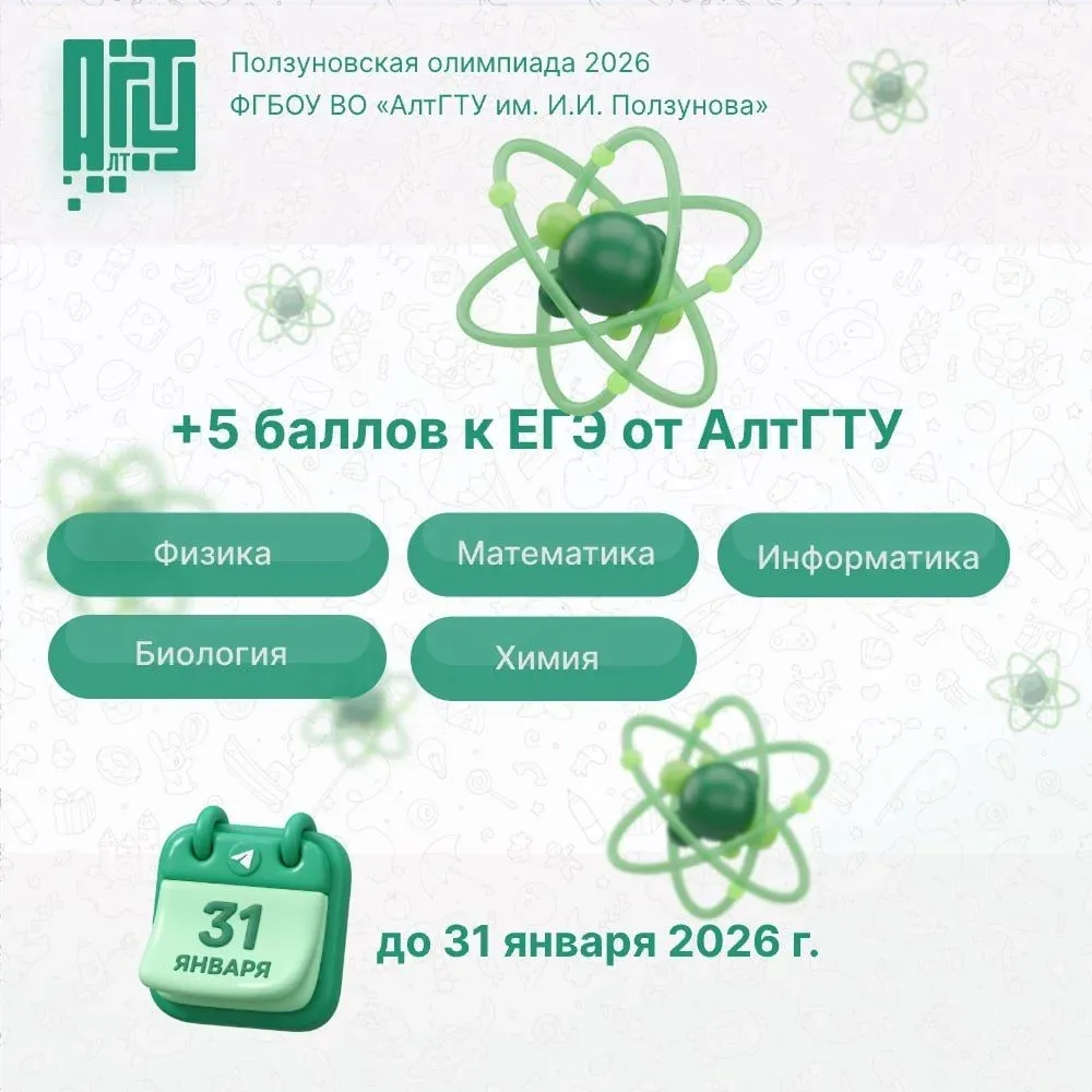 Для 10–11 классов 📚 АлтГТУ проводит «Ползуновскую олимпиаду» по математике, физике, химии, информатике и биологии (предмет на выбор; ограничений на способы решения нет).