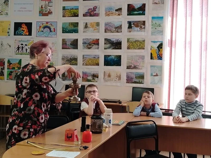 Познавательный час «Как солнце в дом пришло» для третьеклассников от Надежды Николаевны Какориной. Ребята узнали об истории осветительных приборов и даже потрогали старинные экспонаты — например, керосиновую лампу!