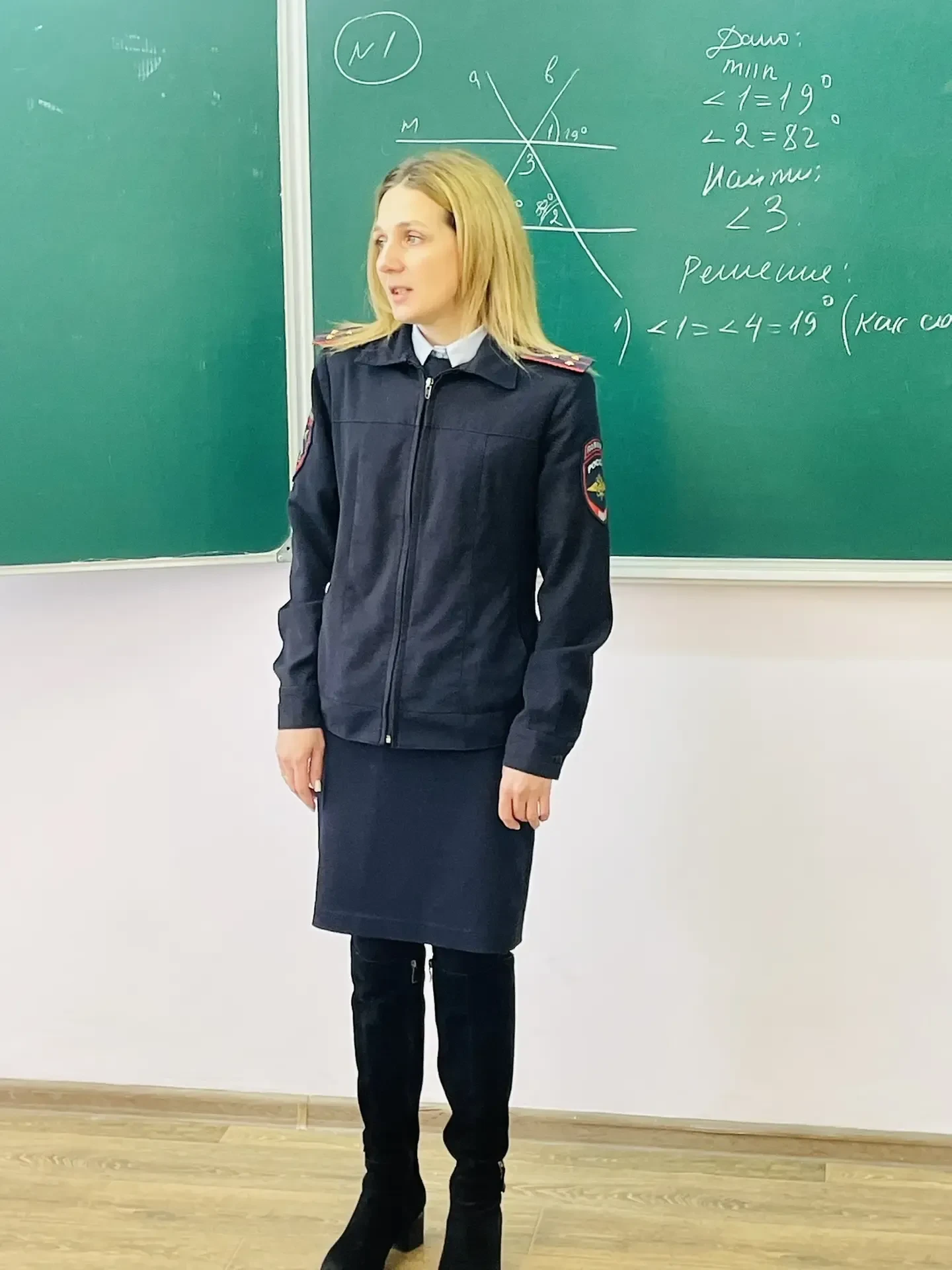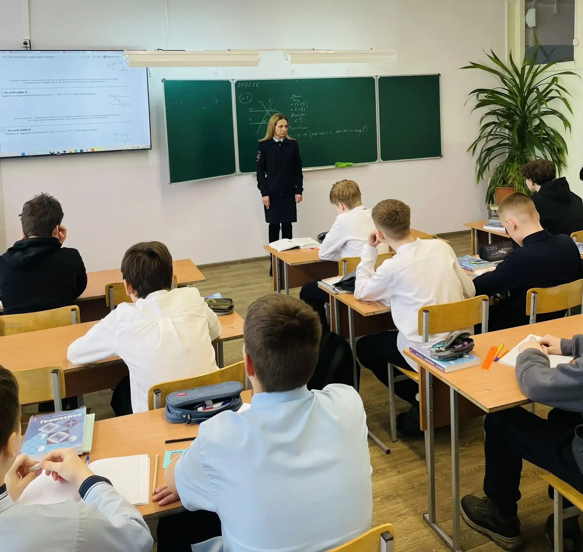 Участники акции — Щелканова Анастасия, Андушкина Виктория, Кузнецов Александр, Федонькин Александр, Богданов Захар, Житкова Алёна и Байбуза София — вместе с советником директора по воспитанию Анастасией Викторовной поздравили тех, кто всегда на страже нашего спокойствия.