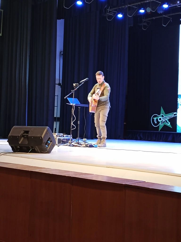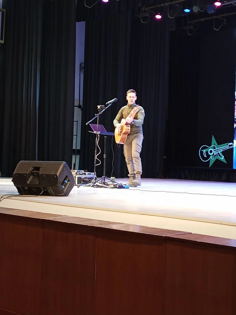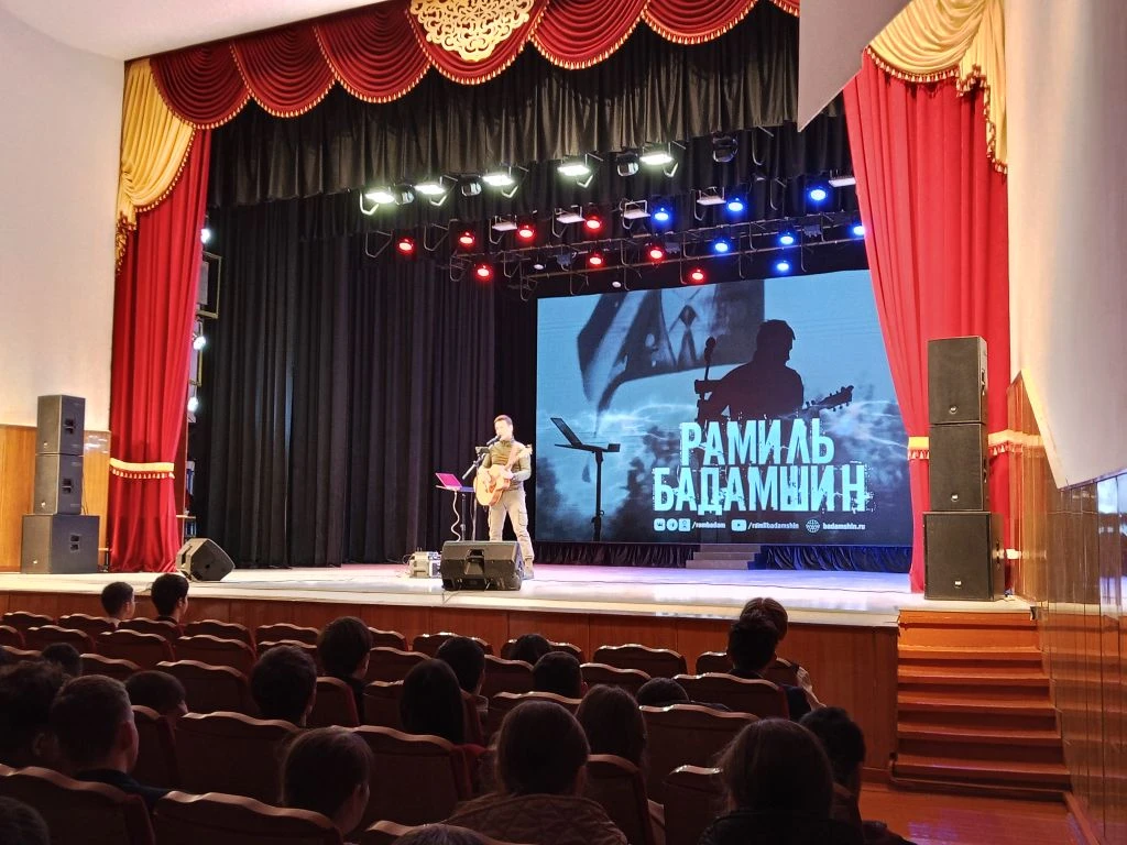 📍Рамиль не только великолепно исполнял песни собственного сочинения, но и создал на сцене ту самую атмосферу единства, о которой мы так часто говорим. Каждая композиция — от пронзительных баллад о доме до мощных маршей о стойкости солдат — находила отклик в сердце. Зал дышал в унисон.