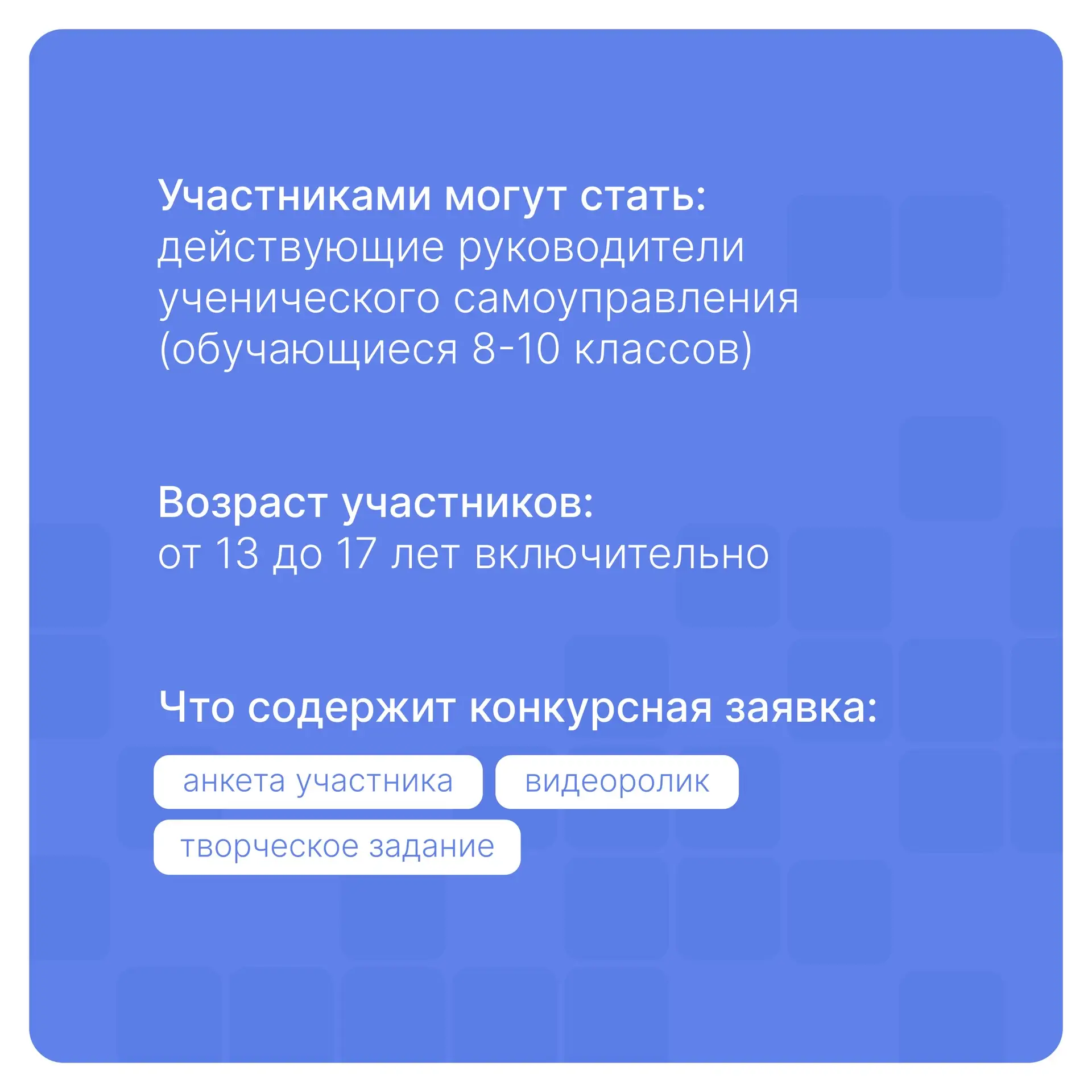 К участию приглашаются действующие руководители советов обучающихся 8–10 классов общеобразовательных организаций в возрасте 13-17 лет включительно.